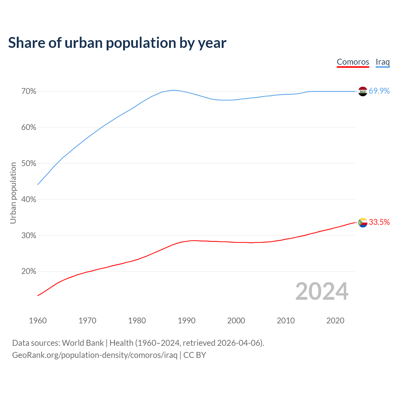 From 2004 to 2024, the share of urban population changed from 28% to 33.5% in Comoros and from 68.2% to 69.9% in Iraq.