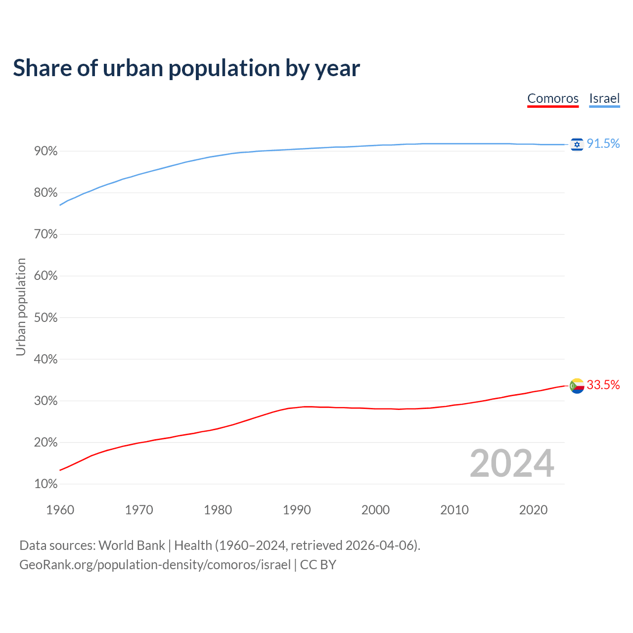 From 2004 to 2024, the share of urban population changed from 28% to 33.5% in Comoros and from 91.6% to 91.5% in Israel.