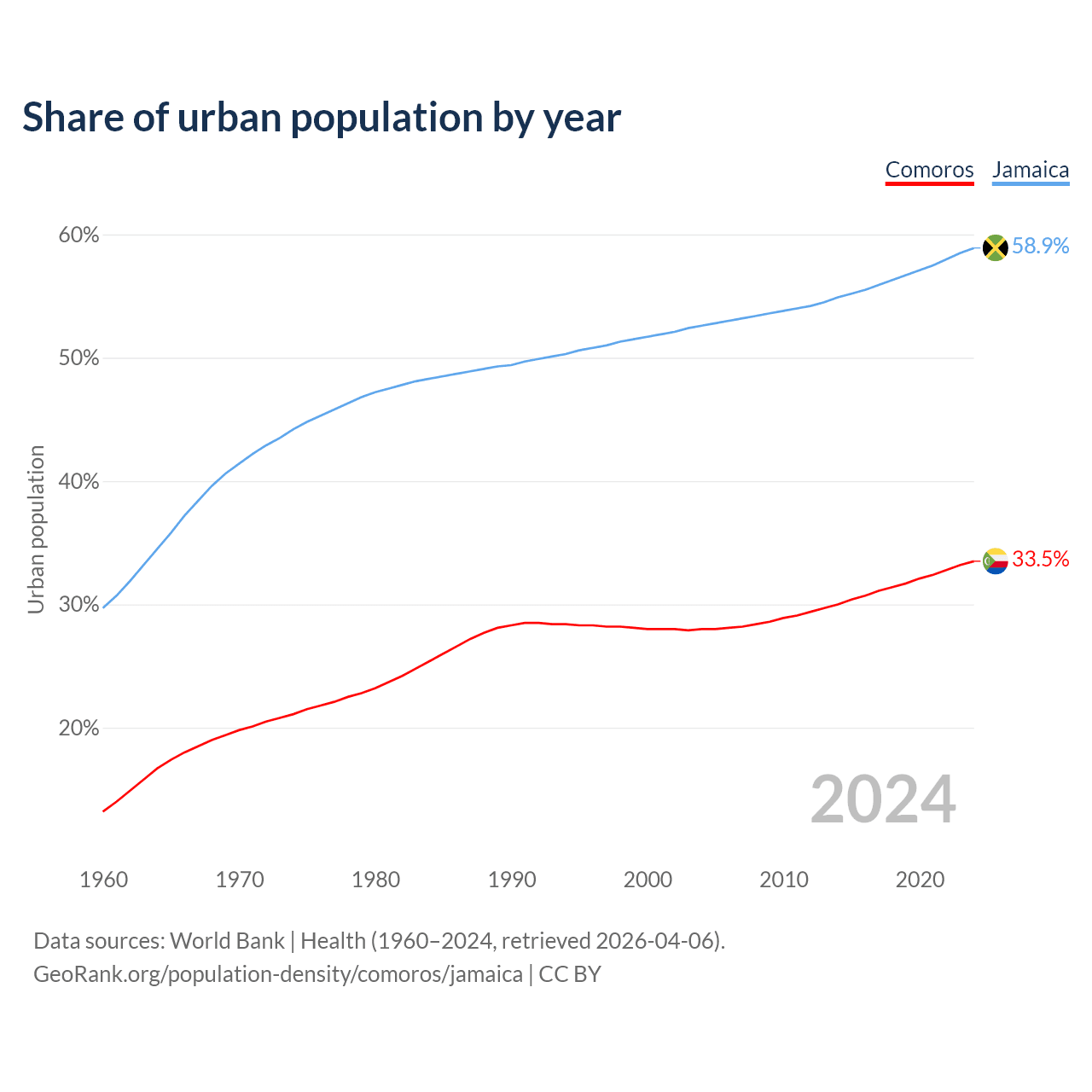 From 2004 to 2024, the share of urban population changed from 28% to 33.5% in Comoros and from 52.6% to 58.9% in Jamaica.