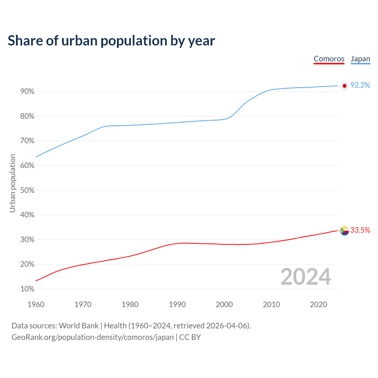 From 2004 to 2024, the share of urban population changed from 28% to 33.5% in Comoros and from 84.4% to 92.2% in Japan.