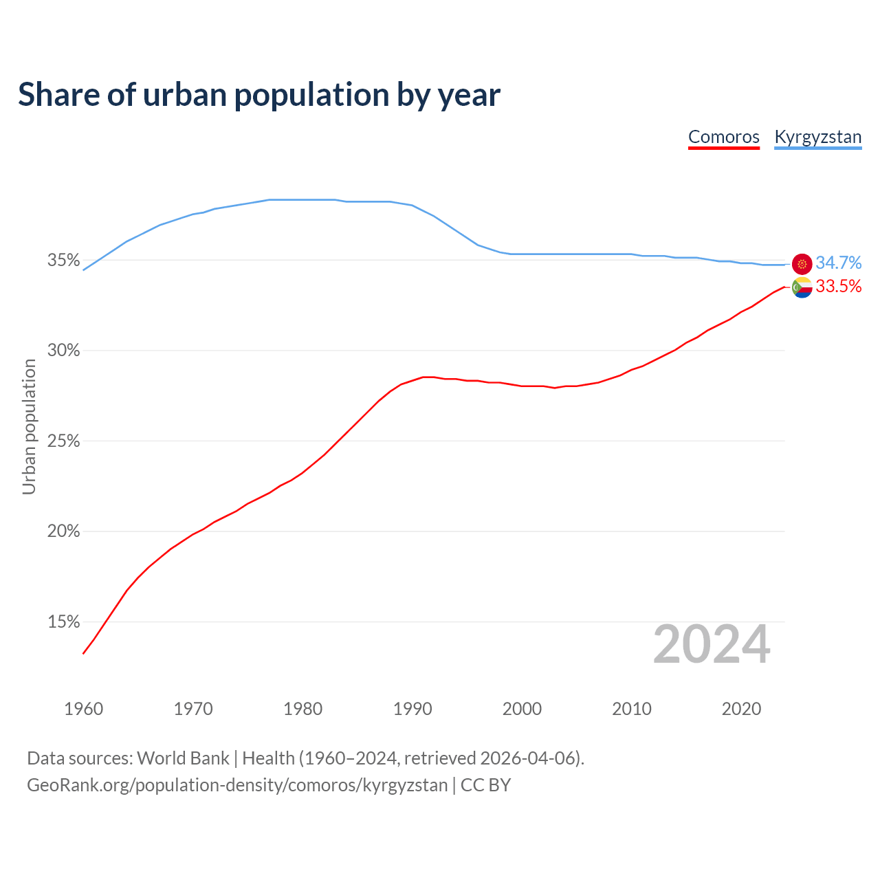 From 2004 to 2024, the share of urban population changed from 28% to 33.5% in Comoros and from 35.3% to 34.7% in Kyrgyzstan.