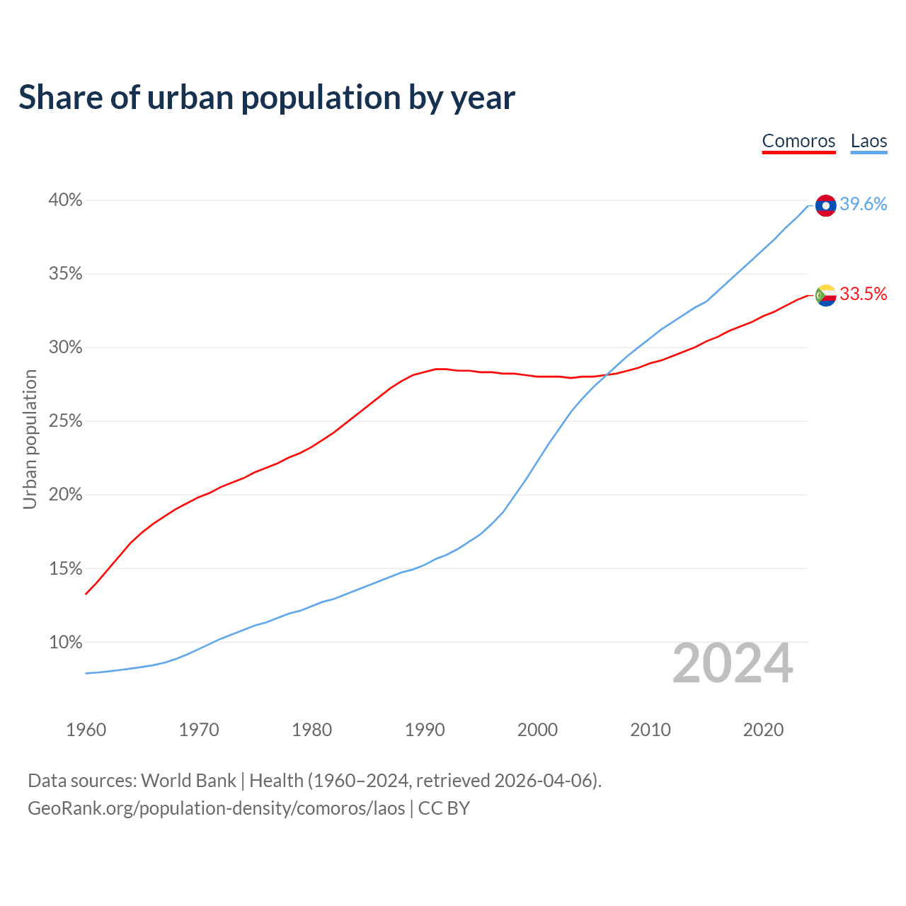 From 2004 to 2024, the share of urban population changed from 28% to 33.5% in Comoros and from 26.5% to 39.6% in Laos.
