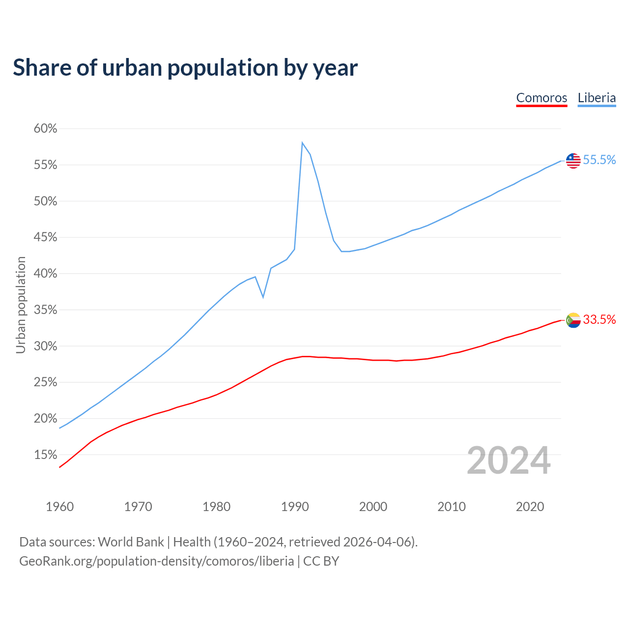From 2004 to 2024, the share of urban population changed from 28% to 33.5% in Comoros and from 45.4% to 55.5% in Liberia.