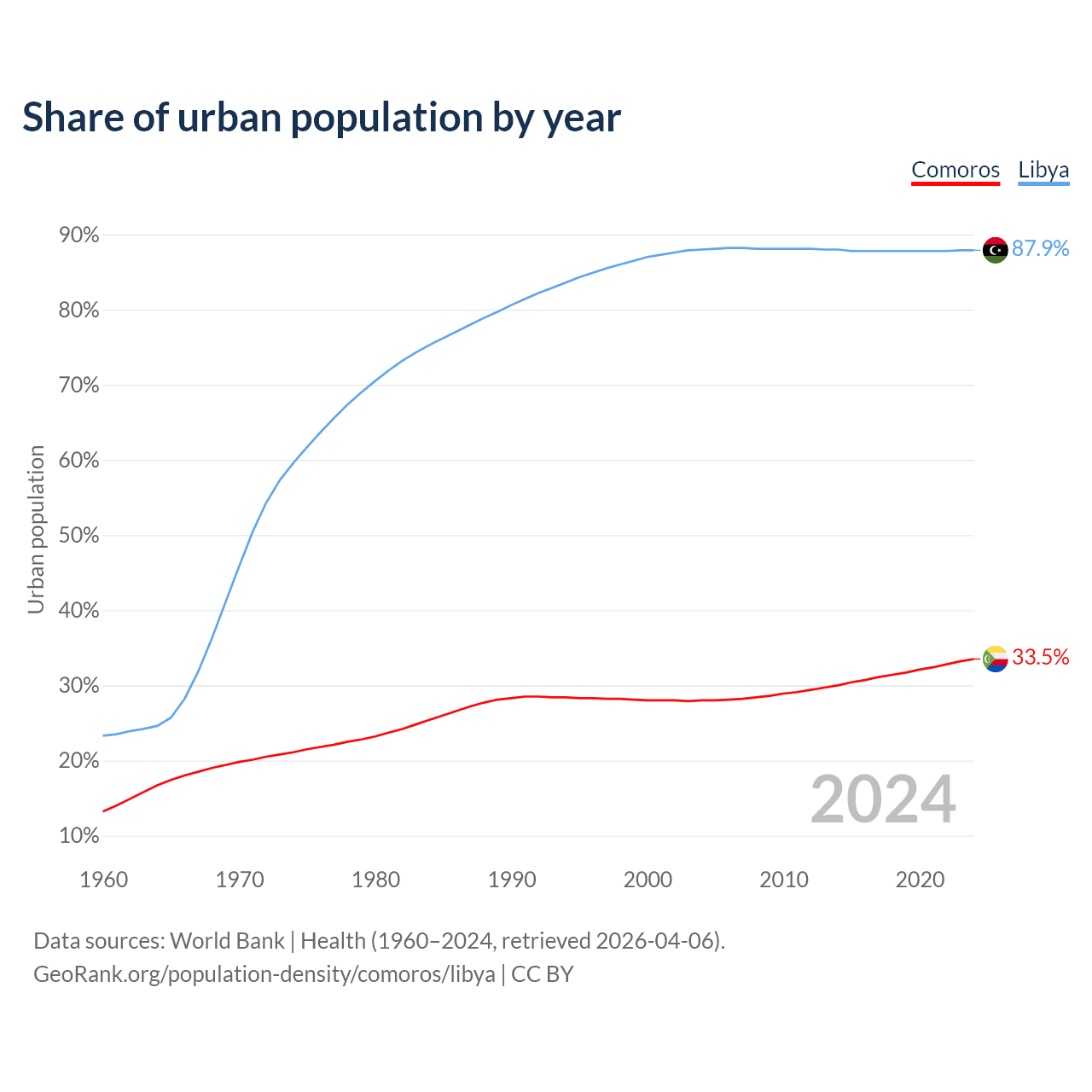From 2004 to 2024, the share of urban population changed from 28% to 33.5% in Comoros and from 88% to 87.9% in Libya.