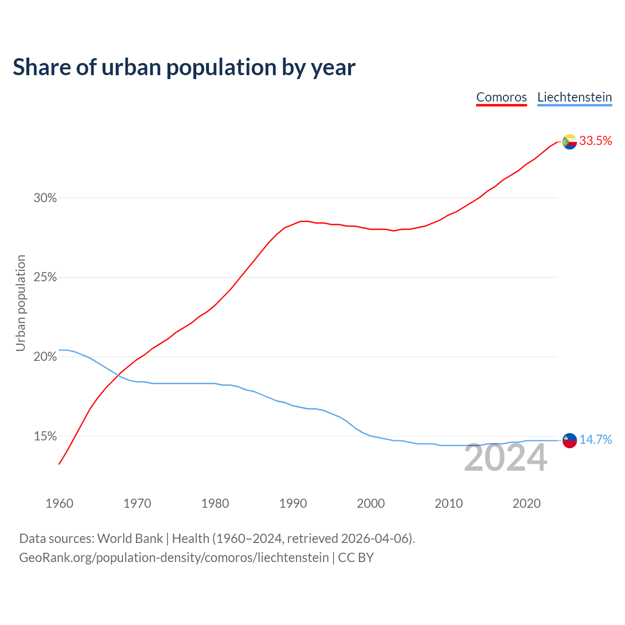 From 2004 to 2024, the share of urban population changed from 28% to 33.5% in Comoros and from 14.7% to 14.7% in Liechtenstein.