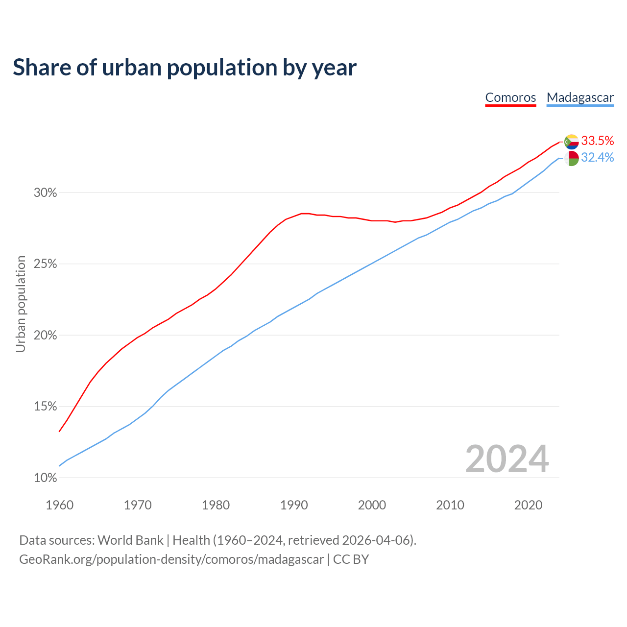 From 2004 to 2024, the share of urban population changed from 28% to 33.5% in Comoros and from 26.2% to 32.4% in Madagascar.