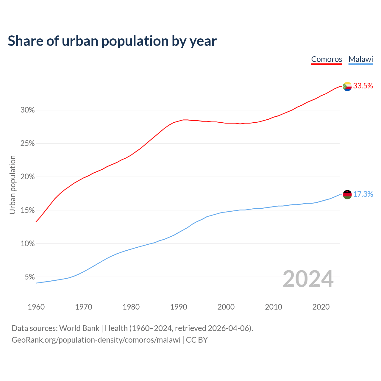 From 2004 to 2024, the share of urban population changed from 28% to 33.5% in Comoros and from 15% to 17.3% in Malawi.