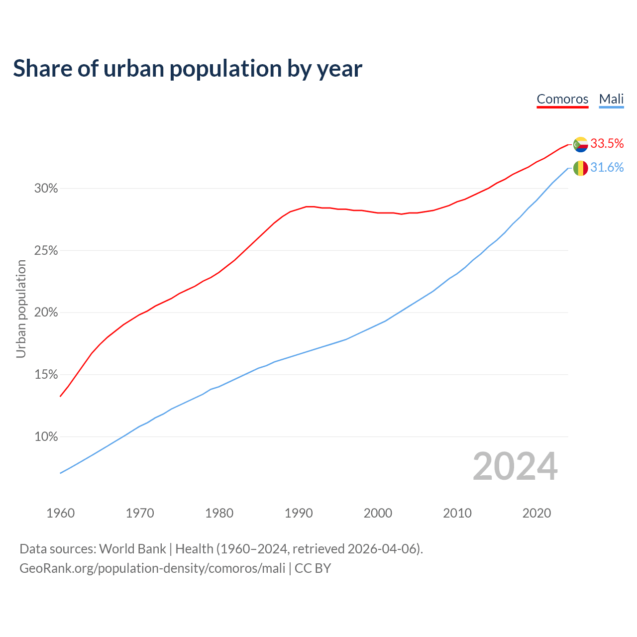 From 2004 to 2024, the share of urban population changed from 28% to 33.5% in Comoros and from 20.5% to 31.6% in Mali.