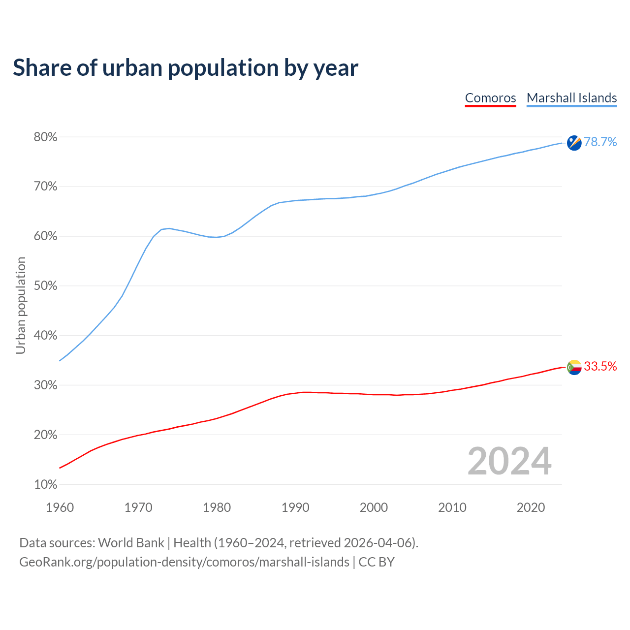 From 2004 to 2024, the share of urban population changed from 28% to 33.5% in Comoros and from 70.1% to 78.7% in the Marshall Islands.