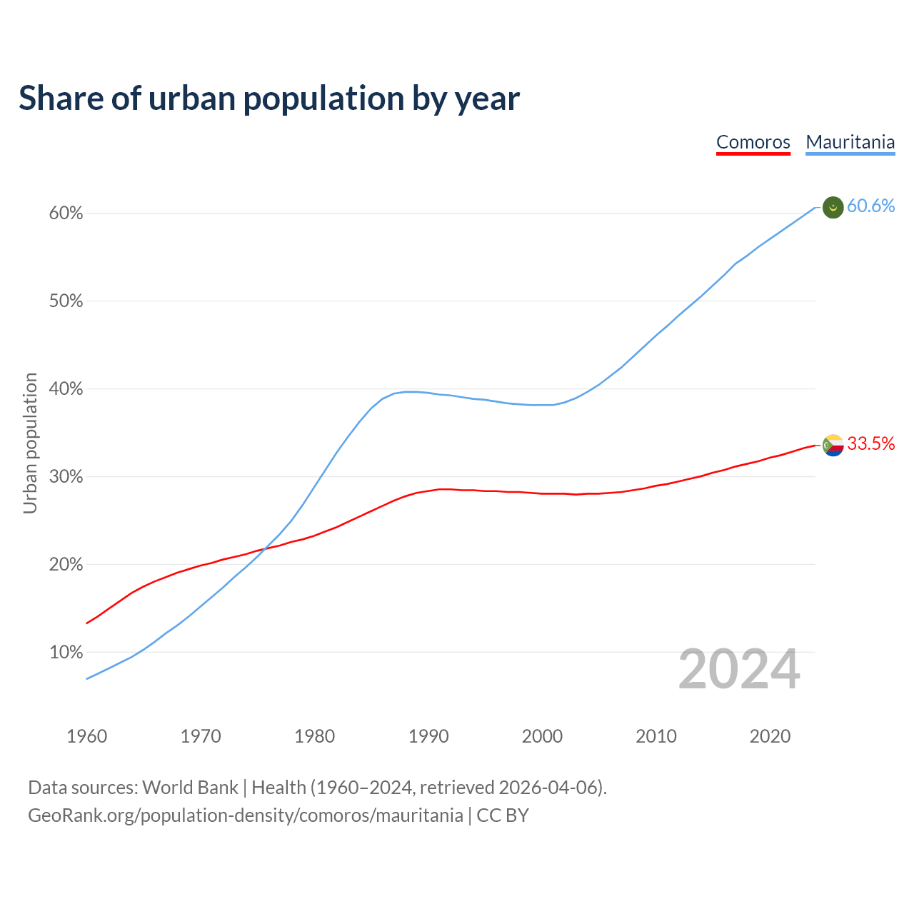 From 2004 to 2024, the share of urban population changed from 28% to 33.5% in Comoros and from 39.6% to 60.6% in Mauritania.