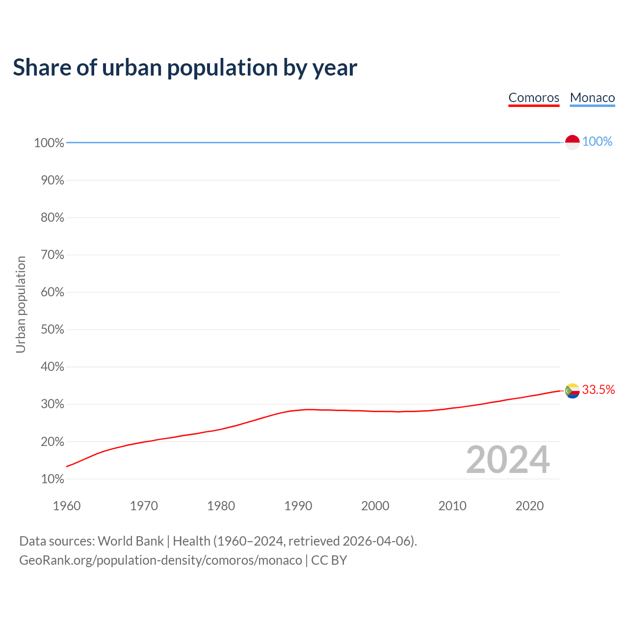From 2004 to 2024, the share of urban population changed from 28% to 33.5% in Comoros and from 100% to 100% in Monaco.