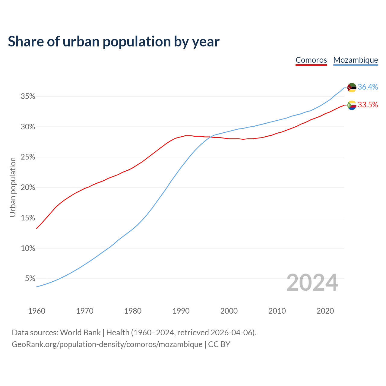 From 2004 to 2024, the share of urban population changed from 28% to 33.5% in Comoros and from 29.9% to 36.4% in Mozambique.
