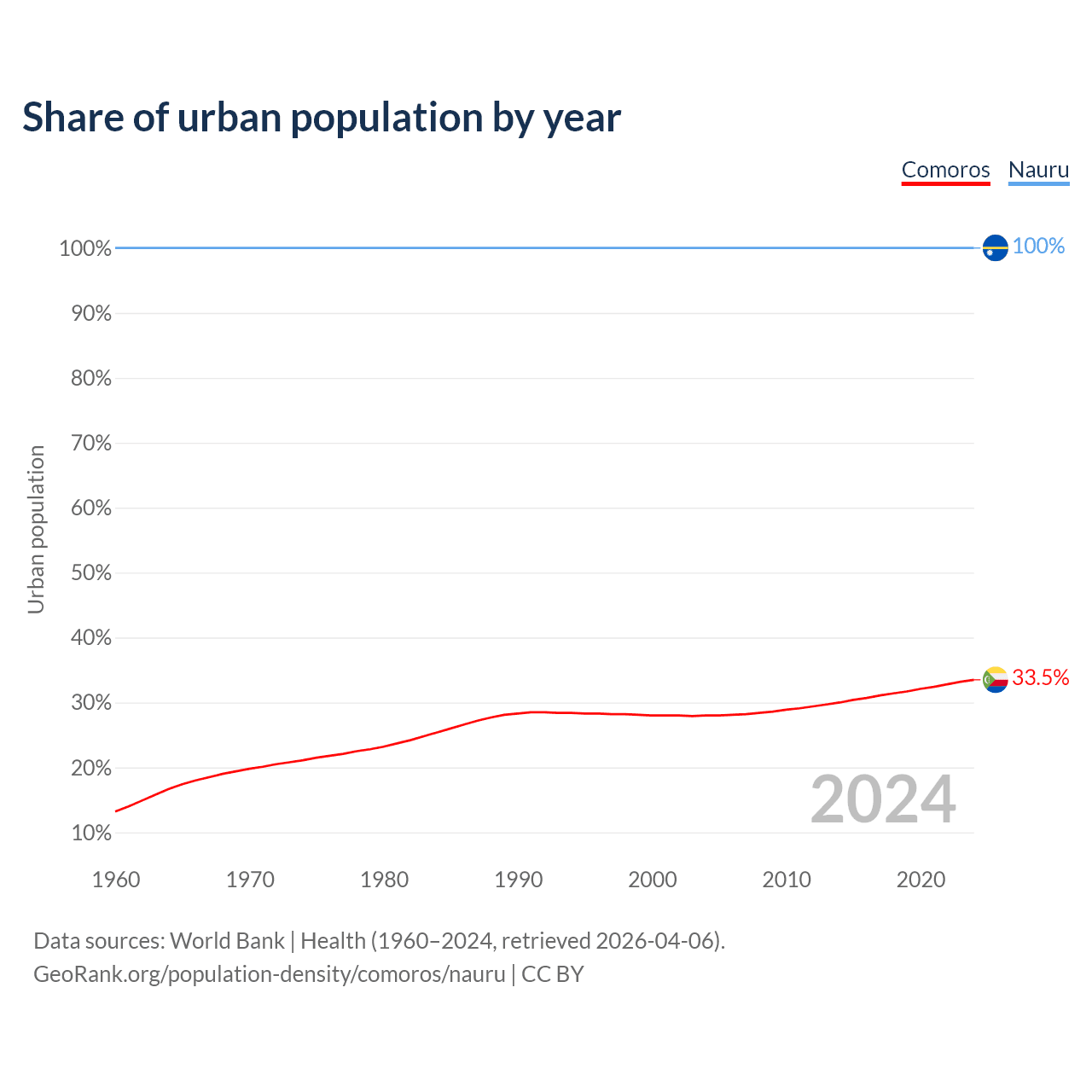 From 2004 to 2024, the share of urban population changed from 28% to 33.5% in Comoros and from 100% to 100% in Nauru.