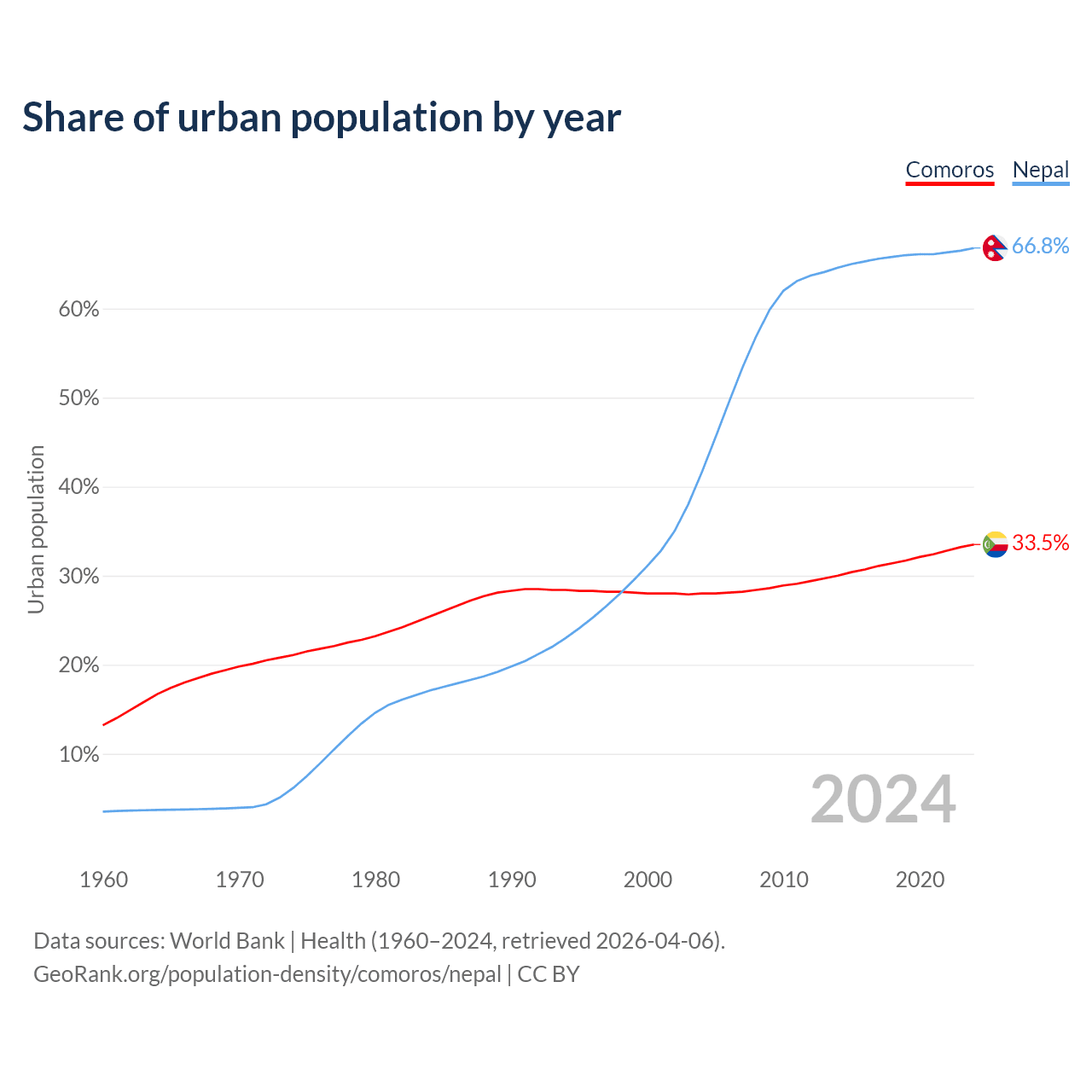 From 2004 to 2024, the share of urban population changed from 28% to 33.5% in Comoros and from 41.6% to 66.8% in Nepal.