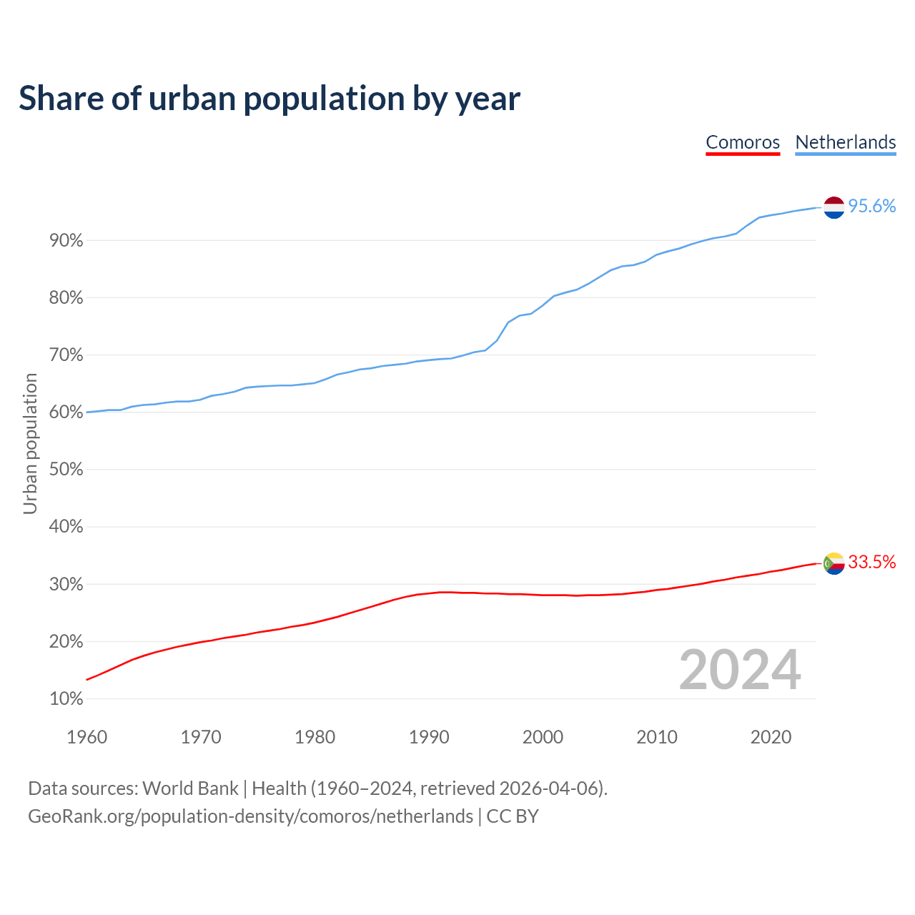 From 2004 to 2024, the share of urban population changed from 28% to 33.5% in Comoros and from 82.3% to 95.6% in the Netherlands.