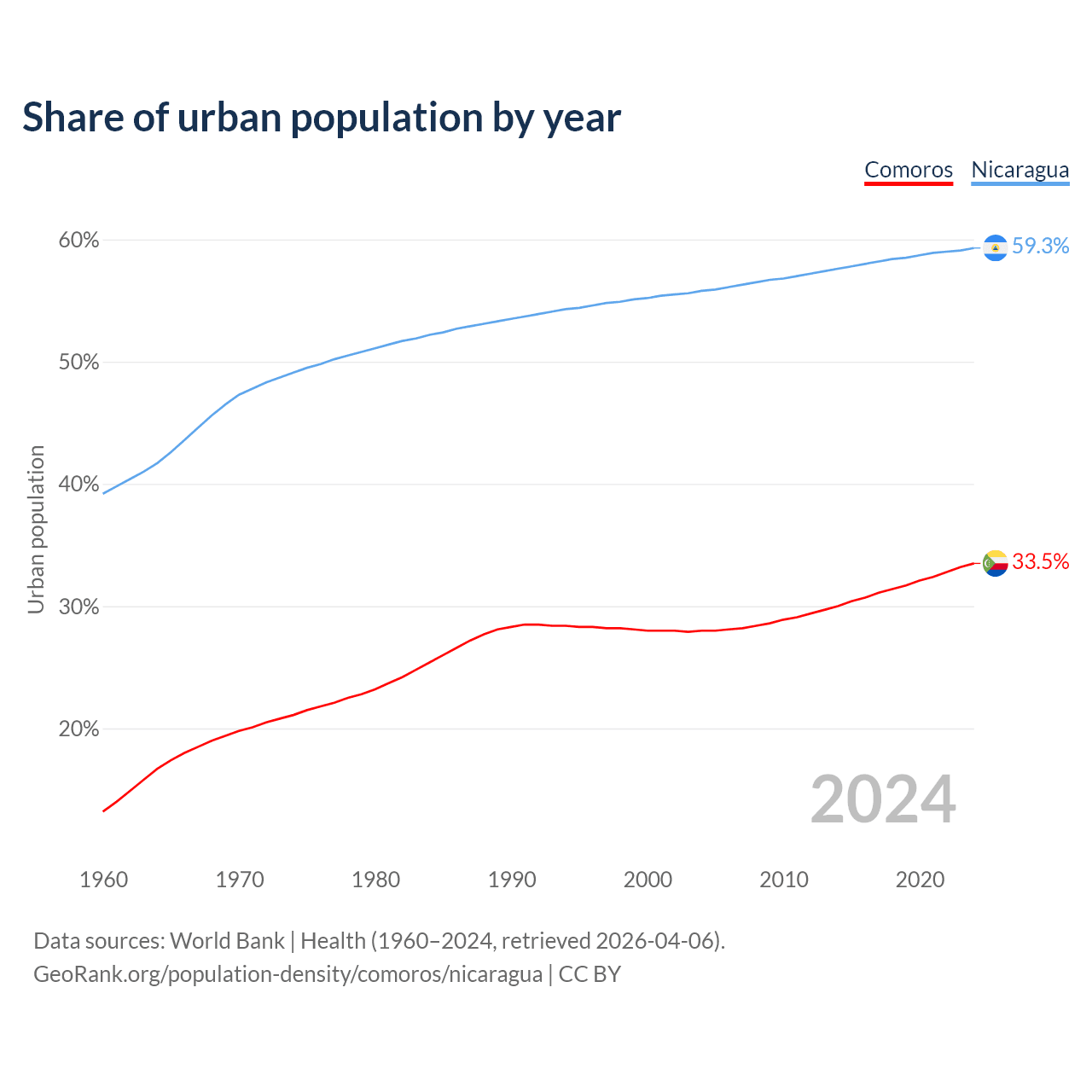 From 2004 to 2024, the share of urban population changed from 28% to 33.5% in Comoros and from 55.8% to 59.3% in Nicaragua.