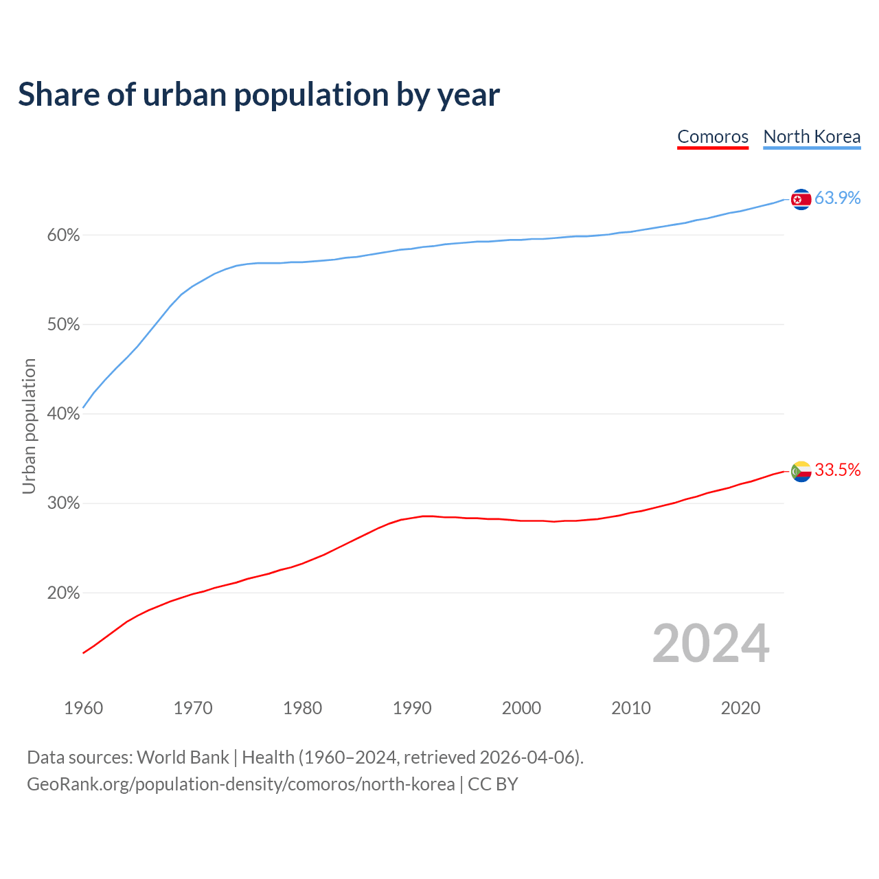 From 2004 to 2024, the share of urban population changed from 28% to 33.5% in Comoros and from 59.7% to 63.9% in North Korea.