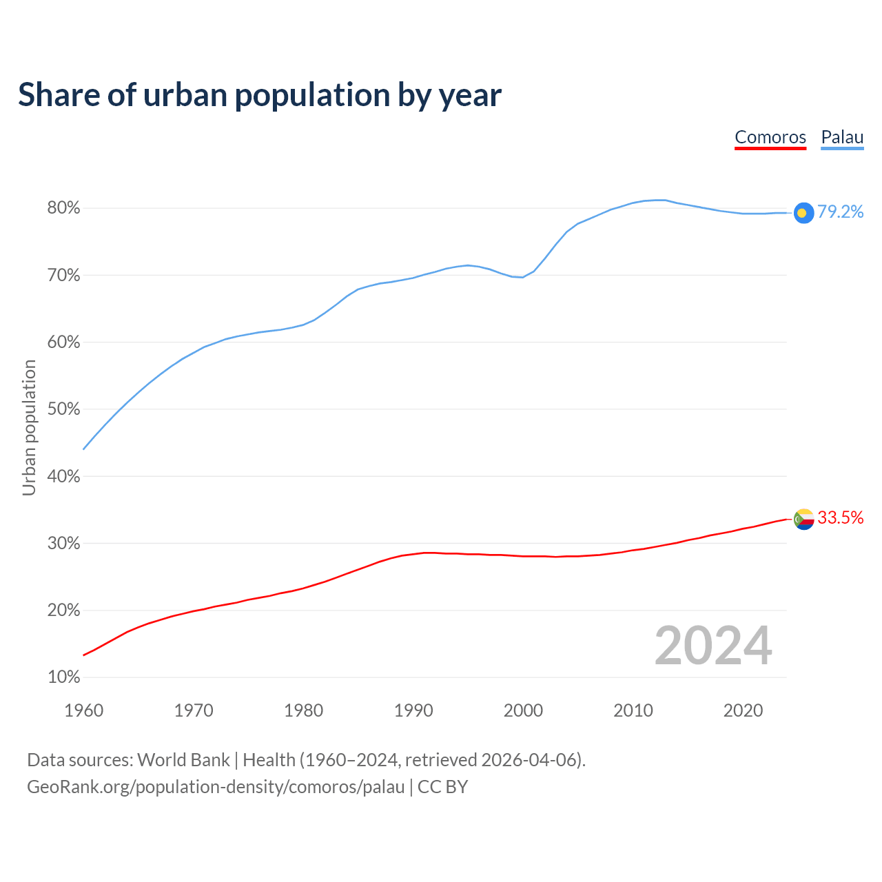 From 2004 to 2024, the share of urban population changed from 28% to 33.5% in Comoros and from 76.4% to 79.2% in Palau.