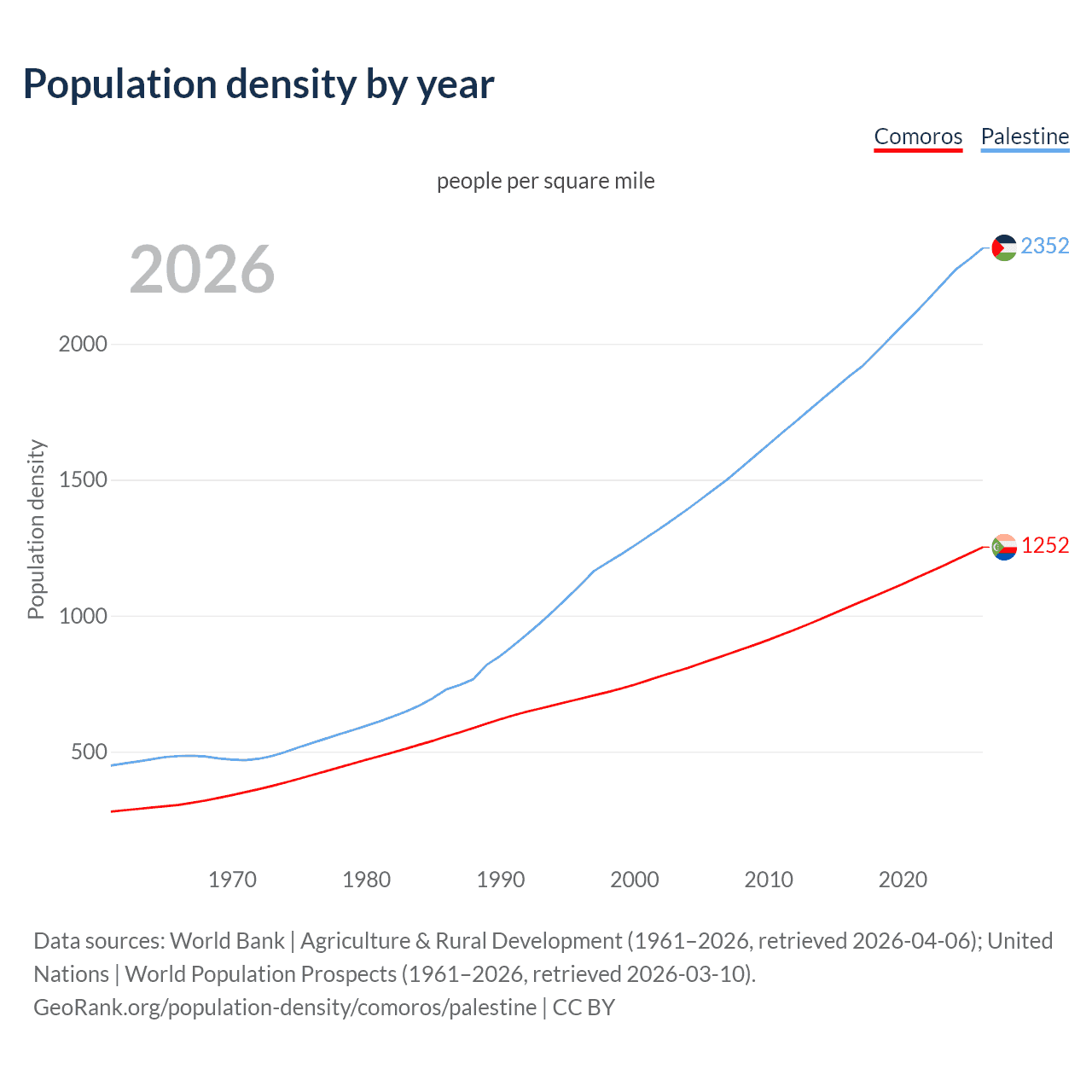From 2006 to 2026, population density in Comoros increased by 48.7%, compared to a 60.5% growth in Palestine.