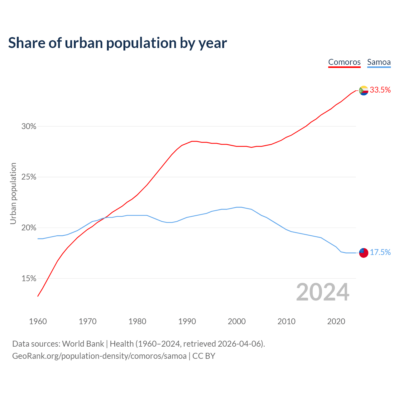 From 2004 to 2024, the share of urban population changed from 28% to 33.5% in Comoros and from 21.5% to 17.5% in Samoa.