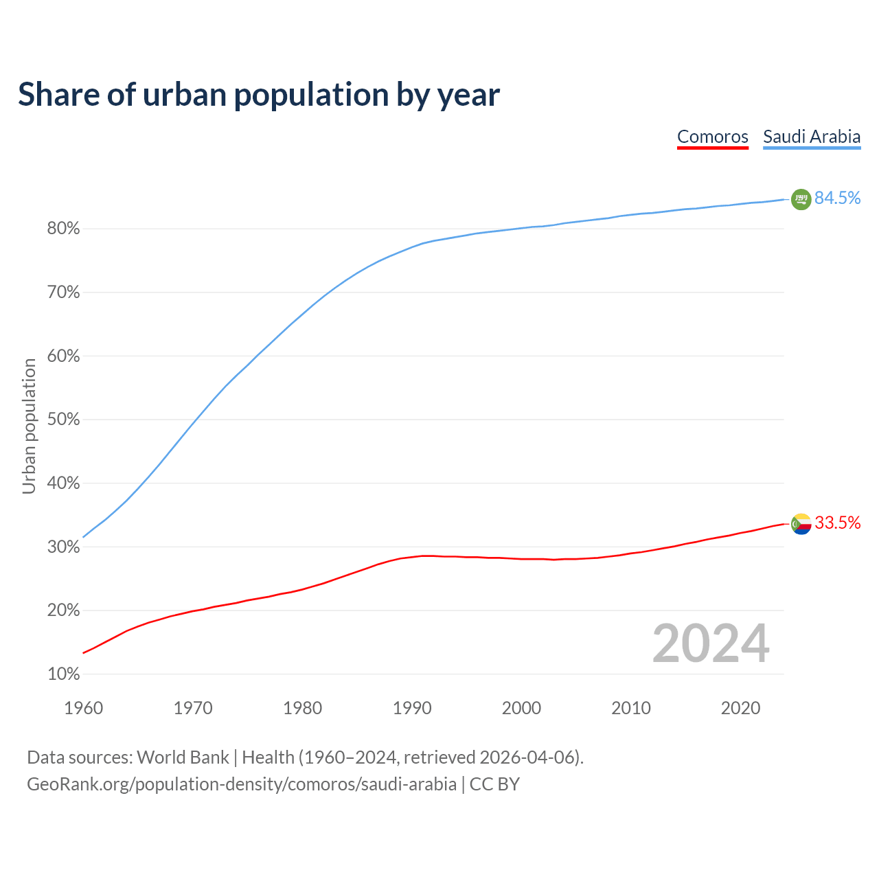 From 2004 to 2024, the share of urban population changed from 28% to 33.5% in Comoros and from 80.8% to 84.5% in Saudi Arabia.