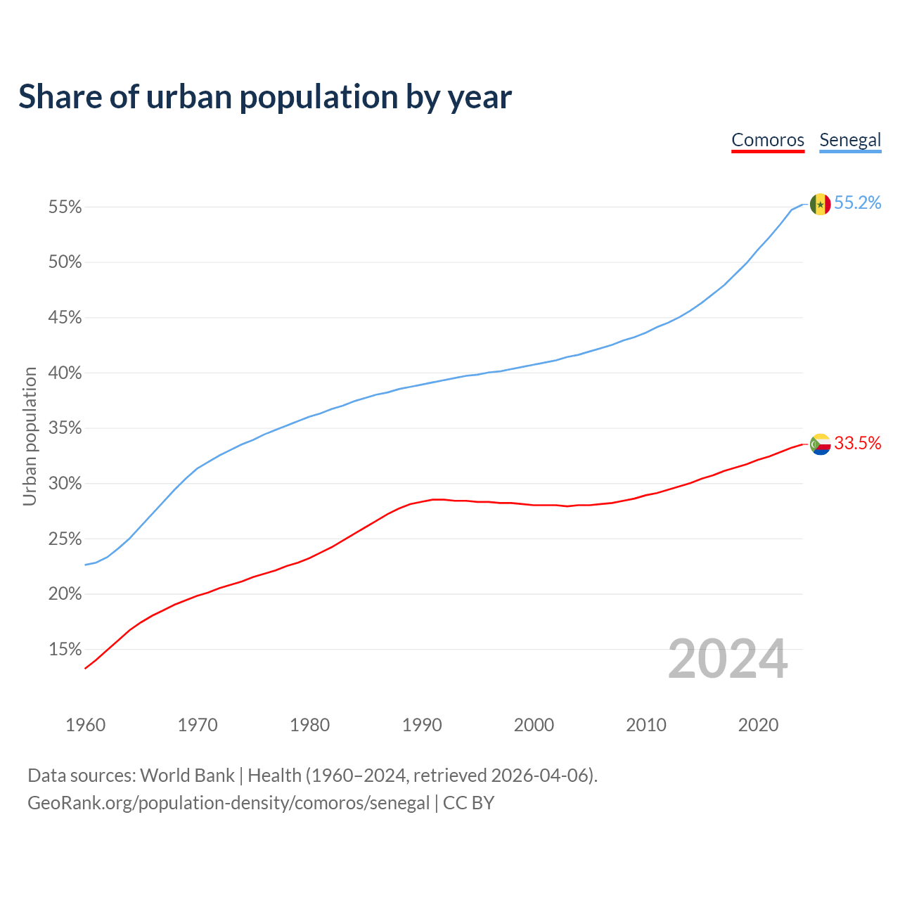 From 2004 to 2024, the share of urban population changed from 28% to 33.5% in Comoros and from 41.6% to 55.2% in Senegal.