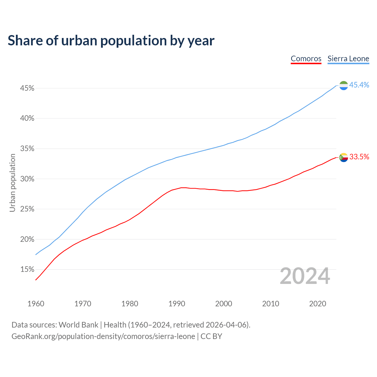 From 2004 to 2024, the share of urban population changed from 28% to 33.5% in Comoros and from 36.5% to 45.4% in Sierra Leone.