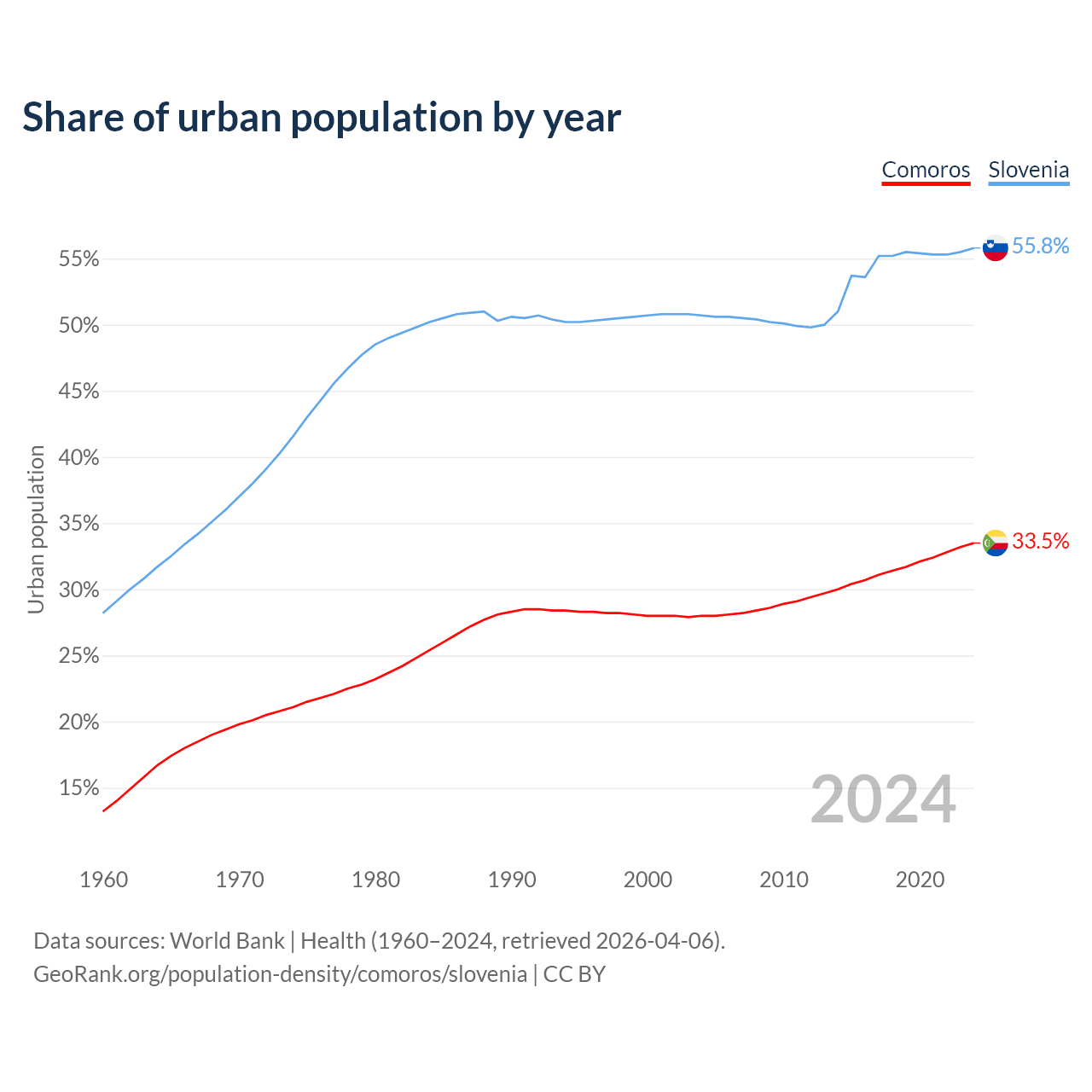 From 2004 to 2024, the share of urban population changed from 28% to 33.5% in Comoros and from 50.7% to 55.8% in Slovenia.