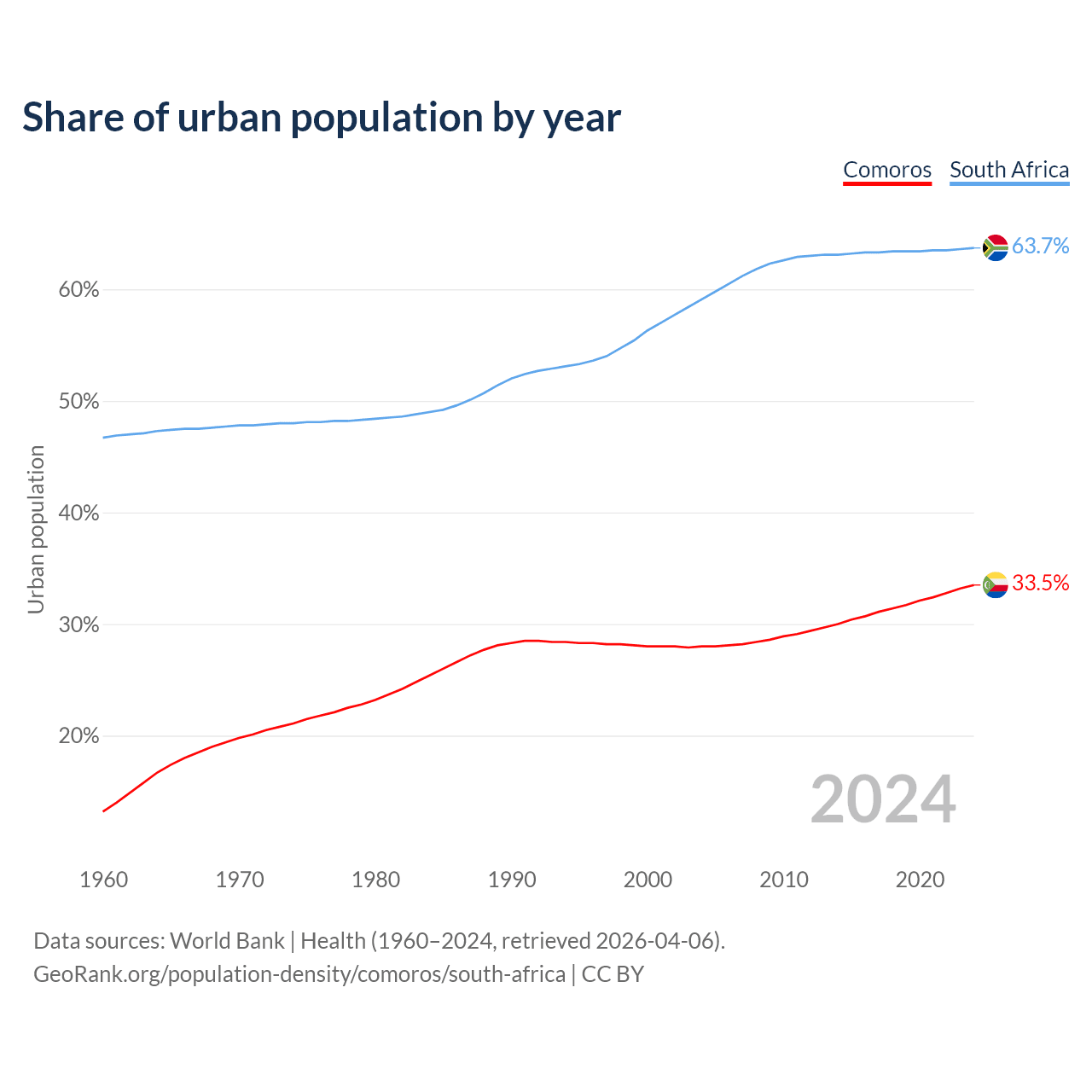 From 2004 to 2024, the share of urban population changed from 28% to 33.5% in Comoros and from 59.1% to 63.7% in South Africa.