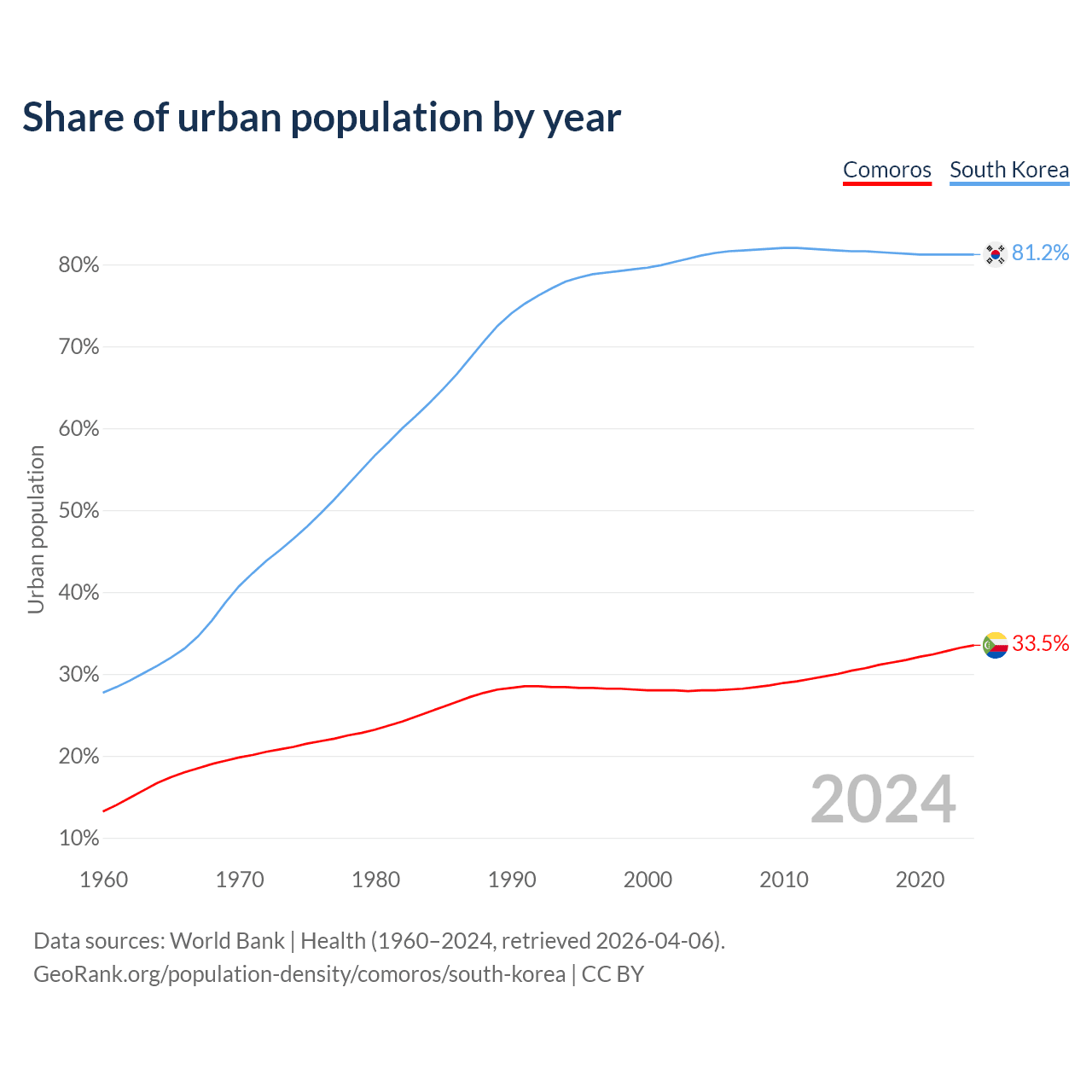 From 2004 to 2024, the share of urban population changed from 28% to 33.5% in Comoros and from 81.1% to 81.2% in South Korea.