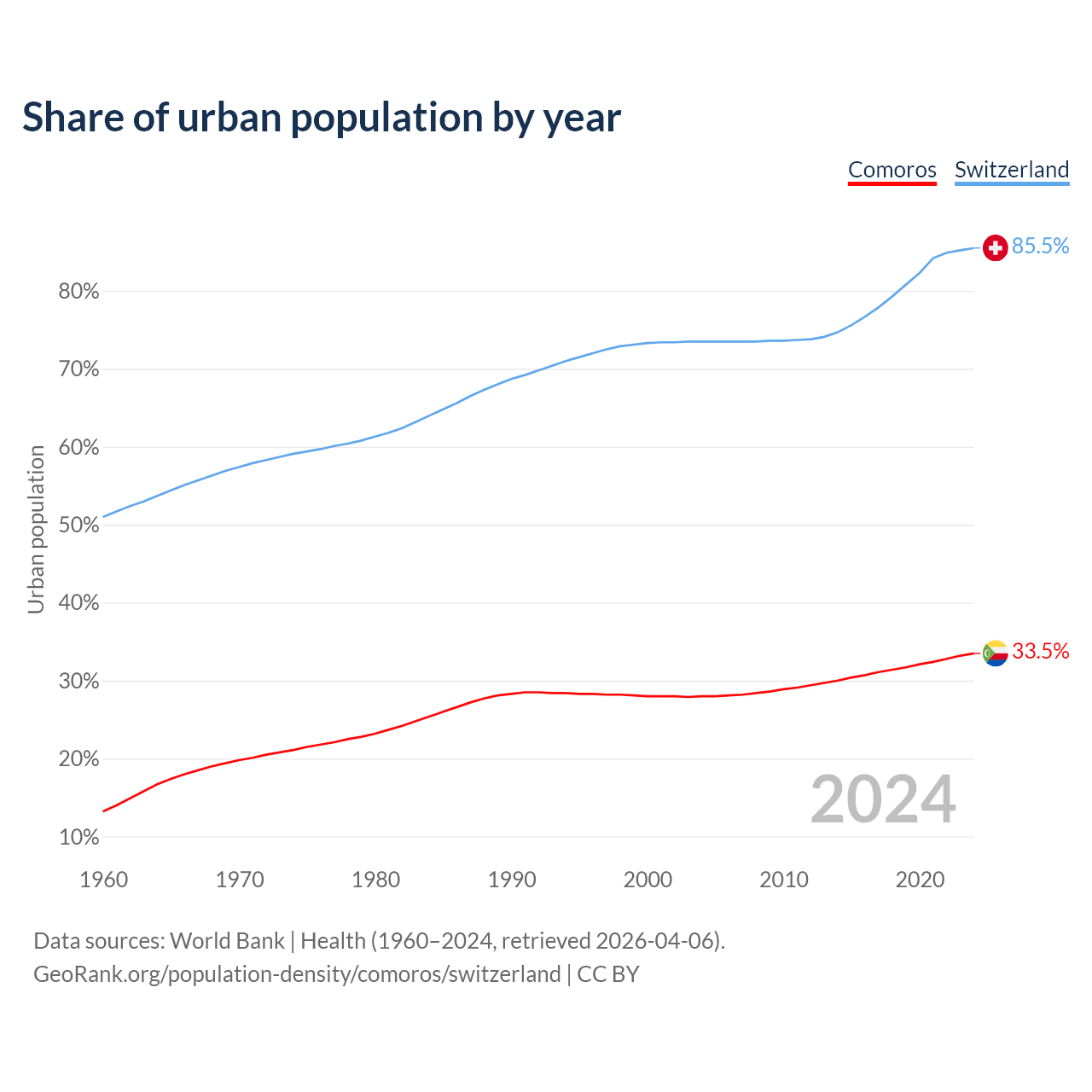 From 2004 to 2024, the share of urban population changed from 28% to 33.5% in Comoros and from 73.5% to 85.5% in Switzerland.