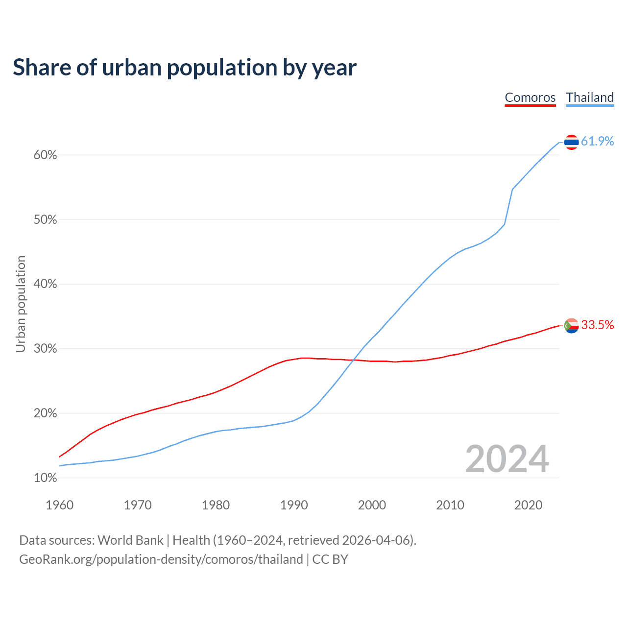 From 2004 to 2024, the share of urban population changed from 28% to 33.5% in Comoros and from 36.8% to 61.9% in Thailand.