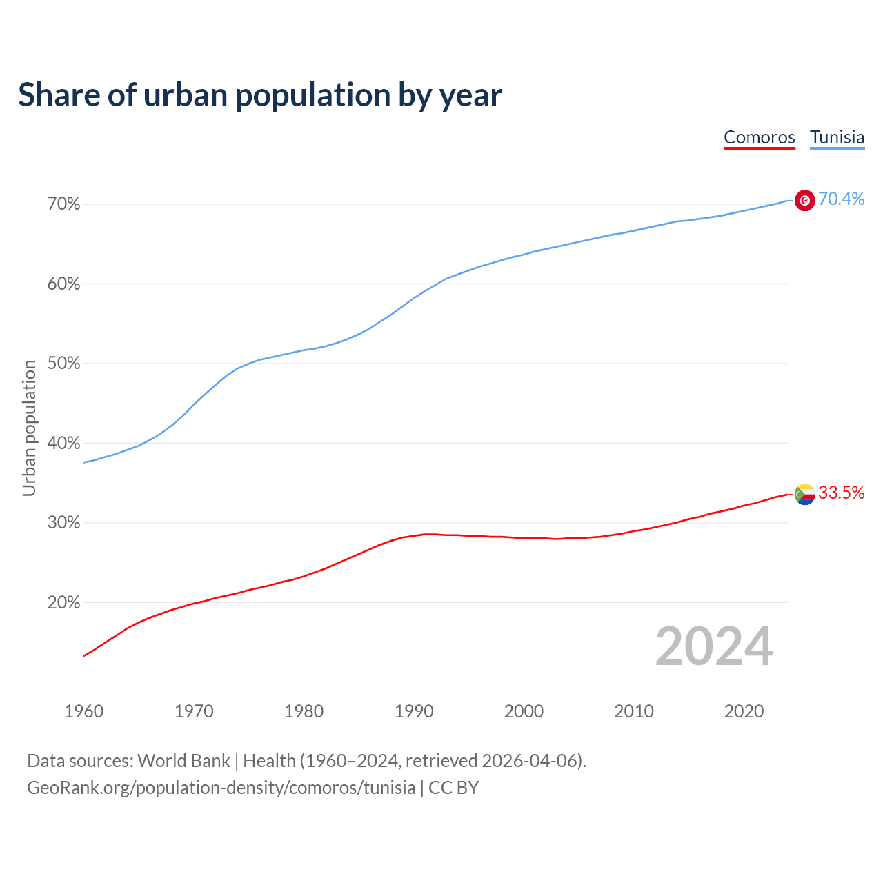 From 2004 to 2024, the share of urban population changed from 28% to 33.5% in Comoros and from 64.9% to 70.4% in Tunisia.