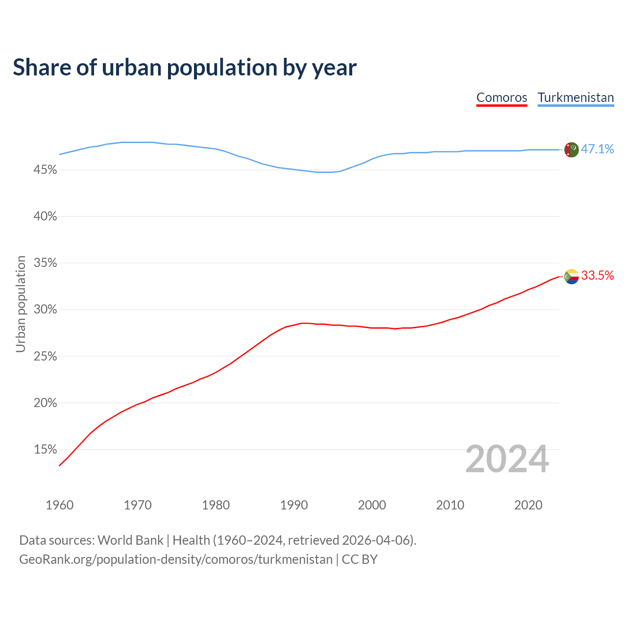 From 2004 to 2024, the share of urban population changed from 28% to 33.5% in Comoros and from 46.7% to 47.1% in Turkmenistan.