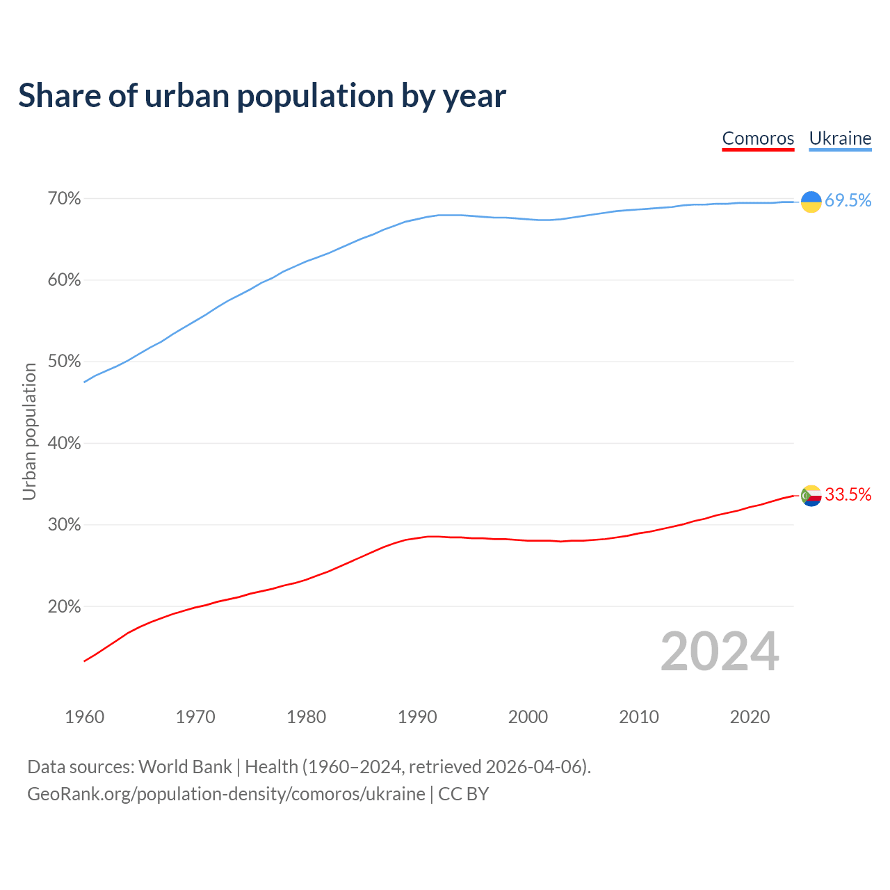 From 2004 to 2024, the share of urban population changed from 28% to 33.5% in Comoros and from 67.6% to 69.5% in Ukraine.
