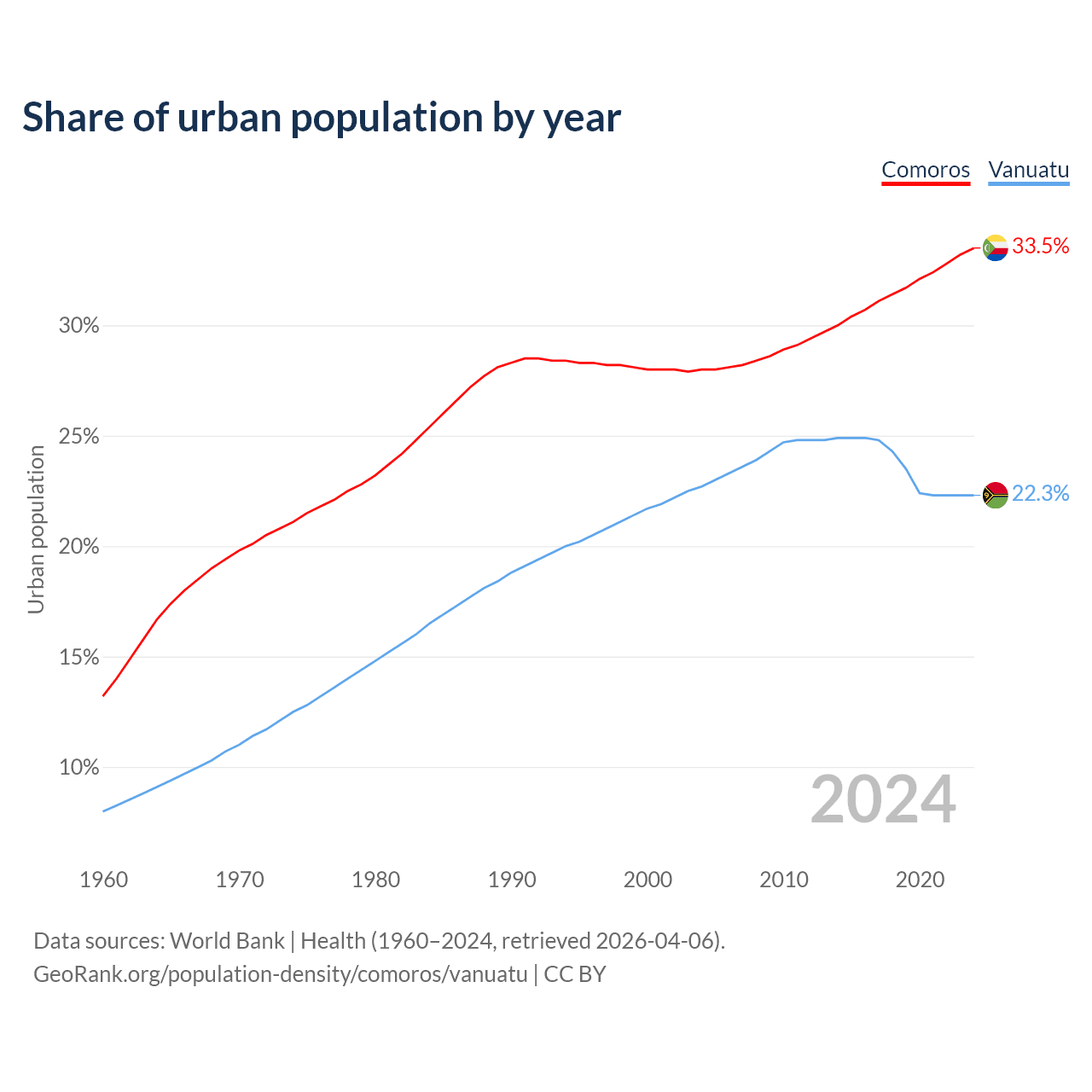 From 2004 to 2024, the share of urban population changed from 28% to 33.5% in Comoros and from 22.7% to 22.3% in Vanuatu.