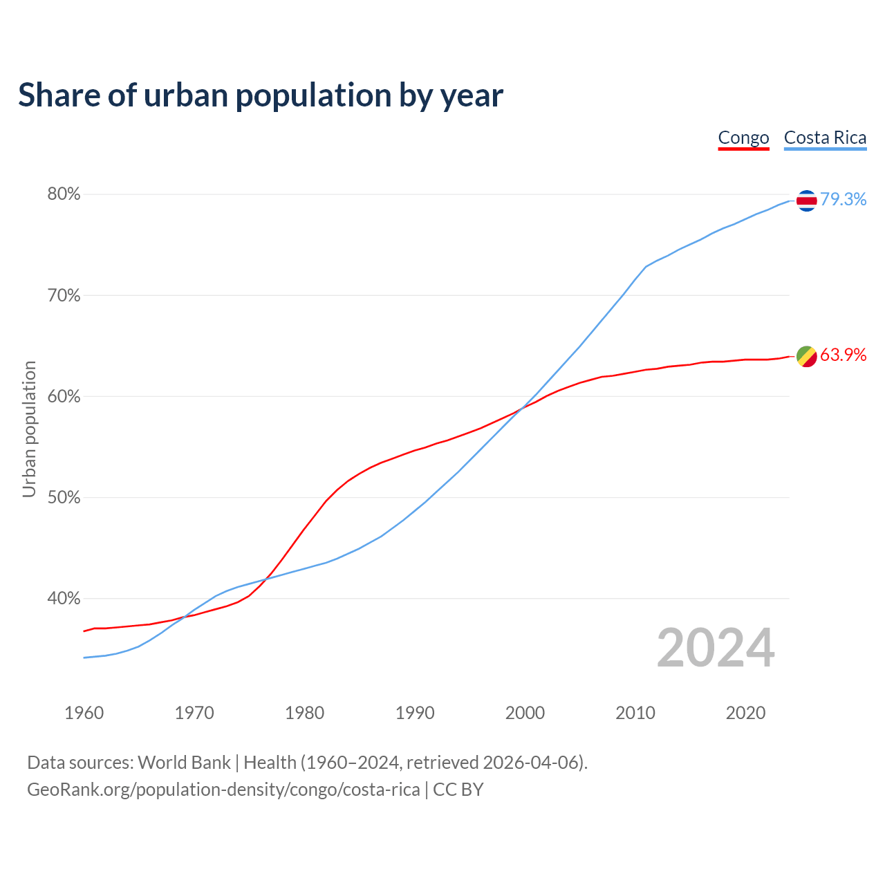 From 2004 to 2024, the share of urban population changed from 60.9% to 63.9% in the Congo and from 63.7% to 79.3% in Costa Rica.