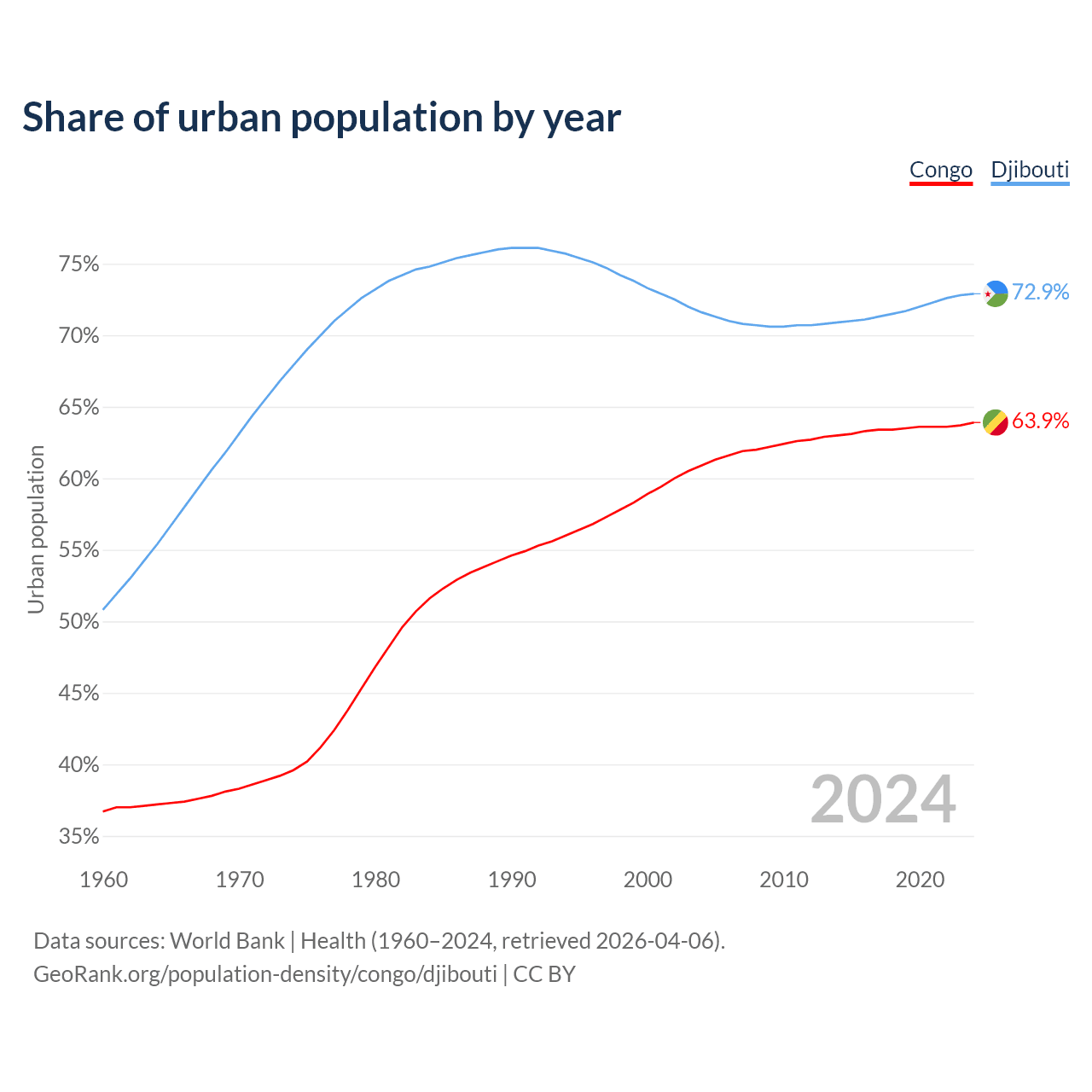 From 2004 to 2024, the share of urban population changed from 60.9% to 63.9% in the Congo and from 71.6% to 72.9% in Djibouti.