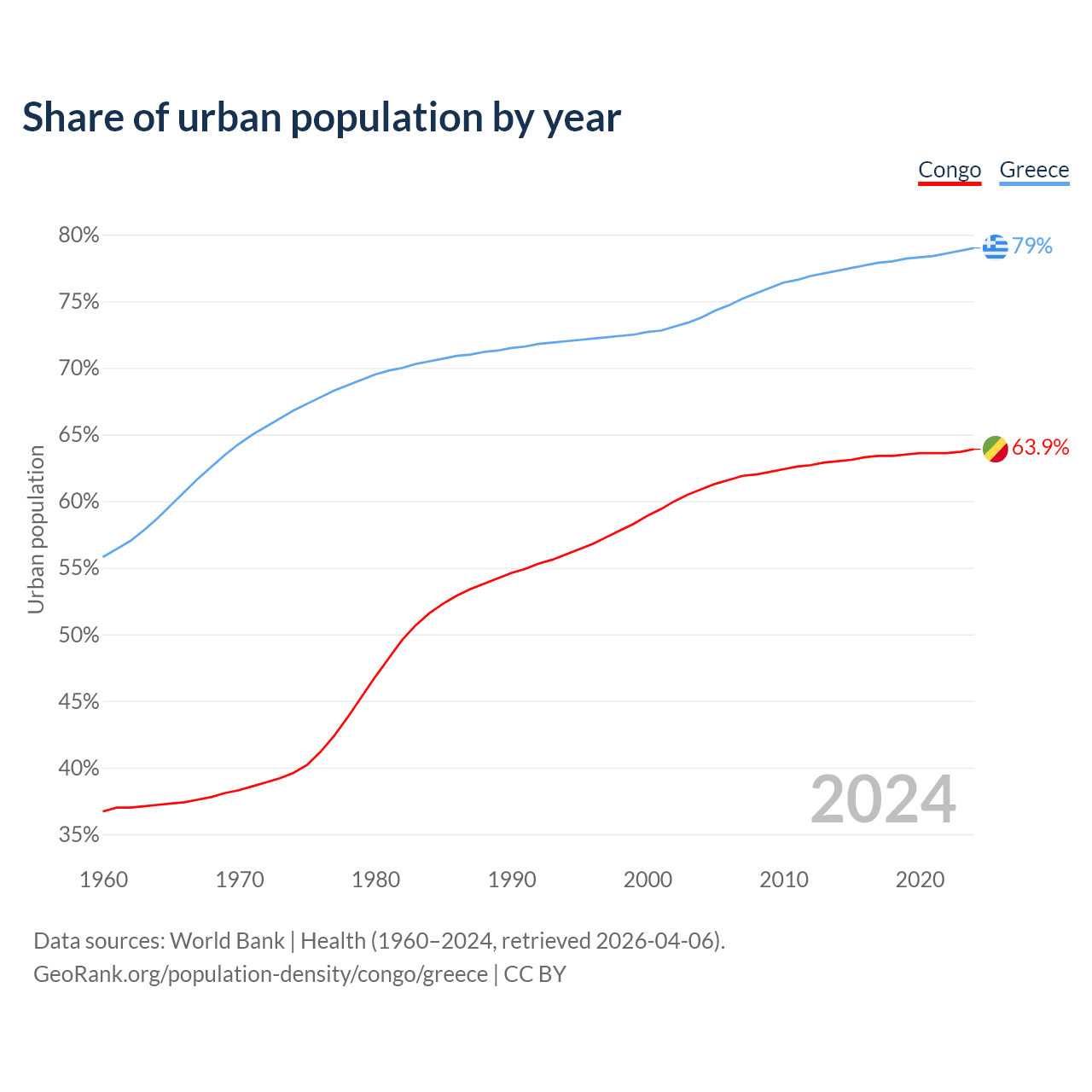 From 2004 to 2024, the share of urban population changed from 60.9% to 63.9% in the Congo and from 73.8% to 79% in Greece.