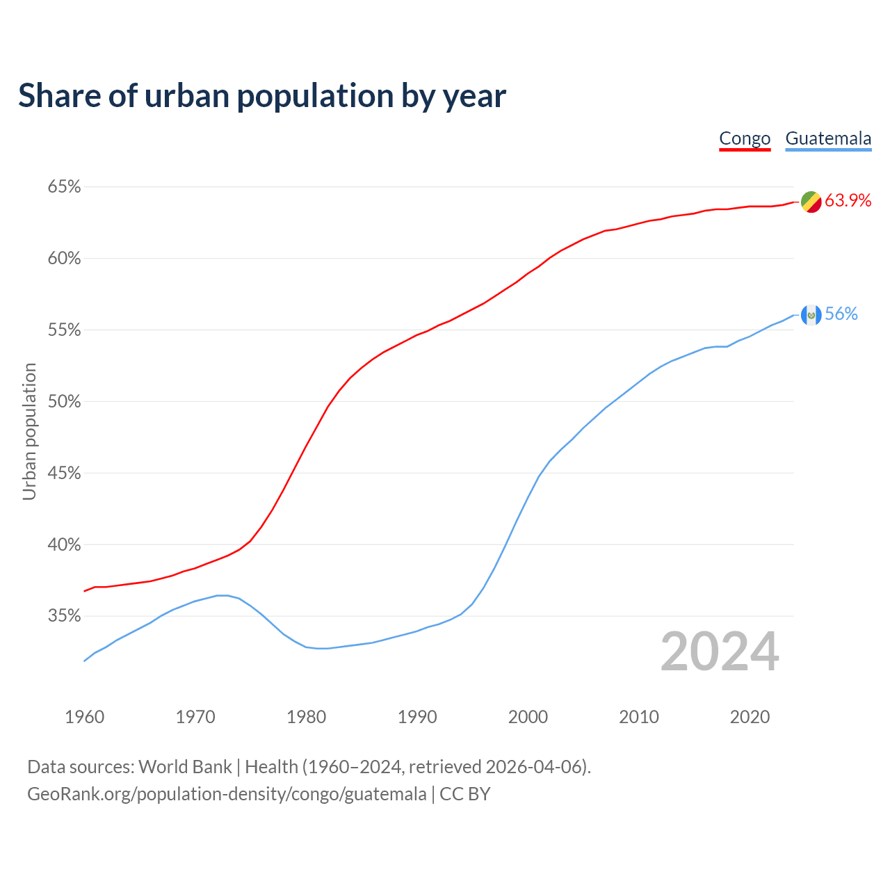 From 2004 to 2024, the share of urban population changed from 60.9% to 63.9% in the Congo and from 47.3% to 56% in Guatemala.