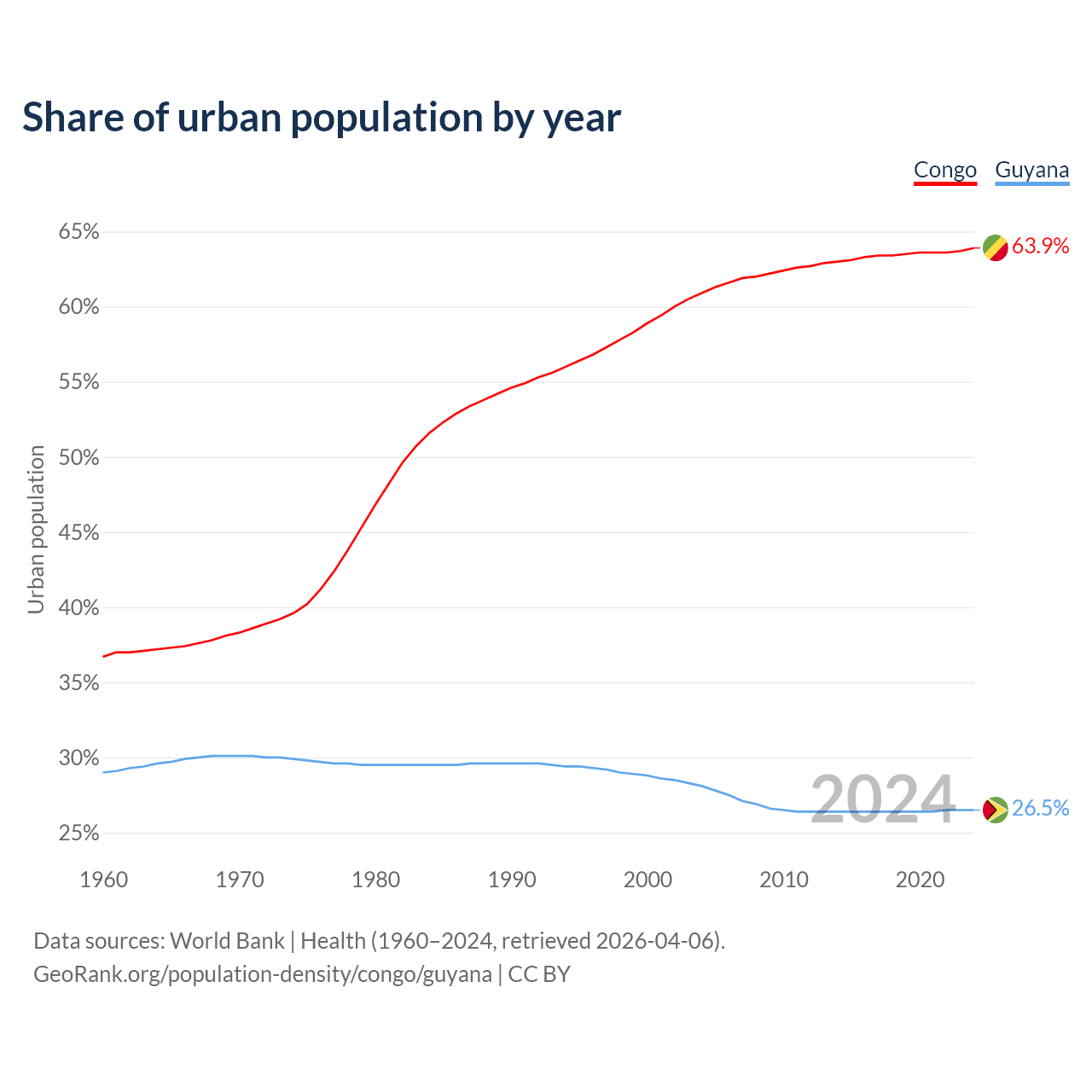 From 2004 to 2024, the share of urban population changed from 60.9% to 63.9% in the Congo and from 28.1% to 26.5% in Guyana.