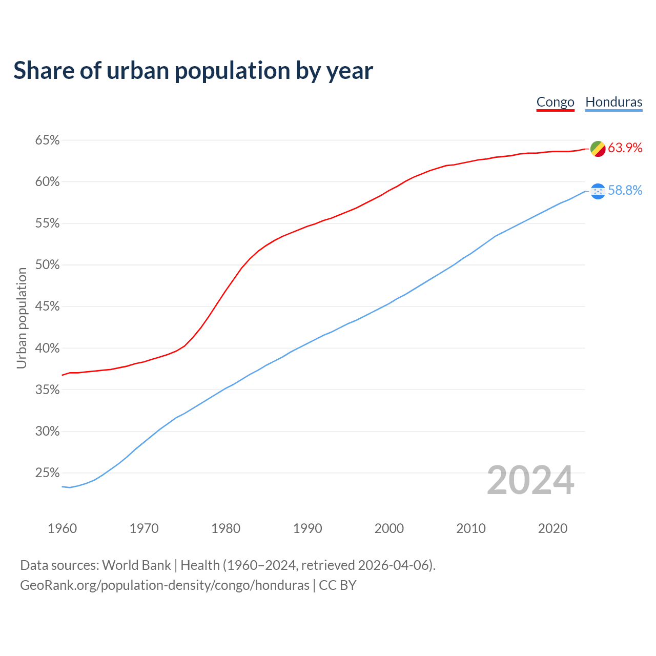 From 2004 to 2024, the share of urban population changed from 60.9% to 63.9% in the Congo and from 47.6% to 58.8% in Honduras.