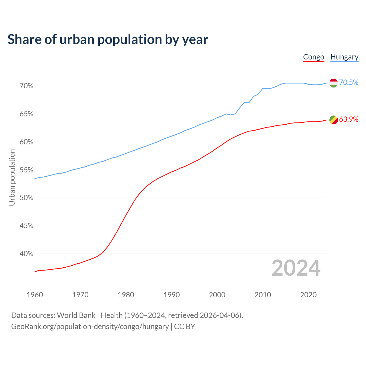 From 2004 to 2024, the share of urban population changed from 60.9% to 63.9% in the Congo and from 65% to 70.5% in Hungary.