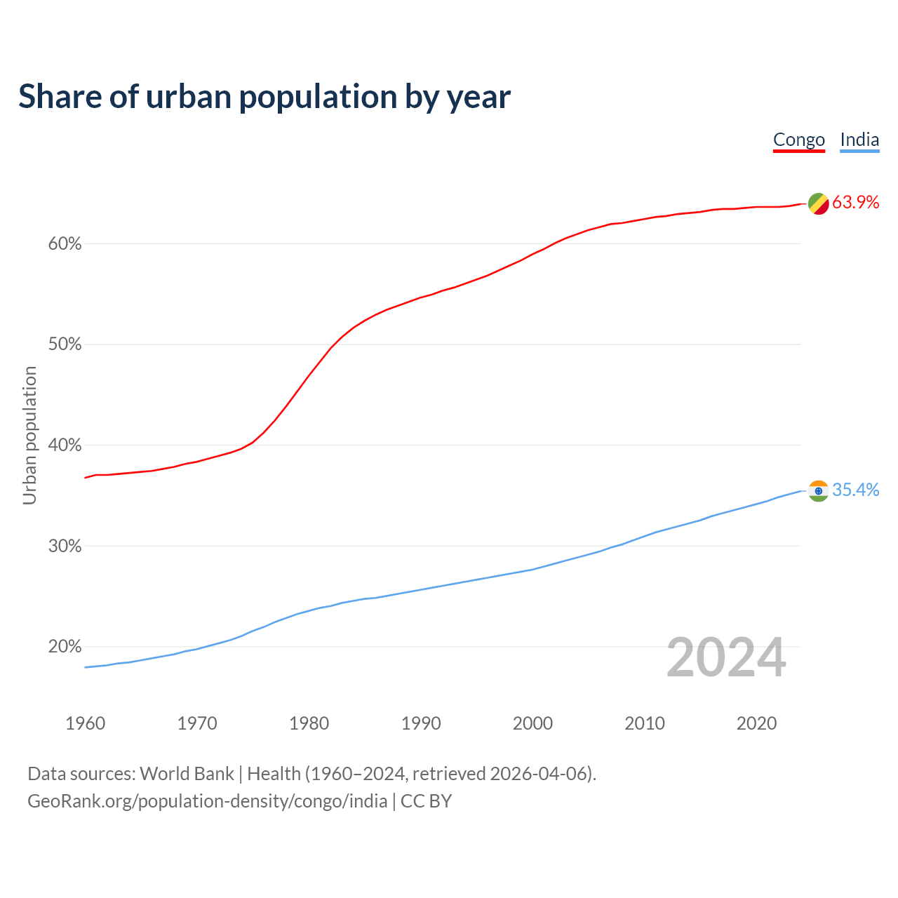 From 2004 to 2024, the share of urban population changed from 60.9% to 63.9% in the Congo and from 28.8% to 35.4% in India.