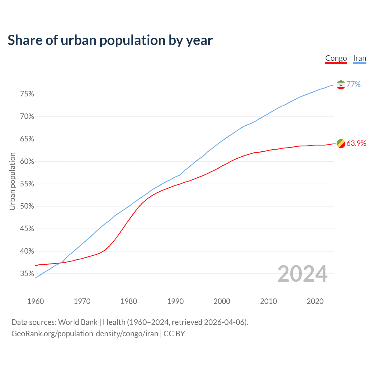 From 2004 to 2024, the share of urban population changed from 60.9% to 63.9% in the Congo and from 67.3% to 77% in Iran.