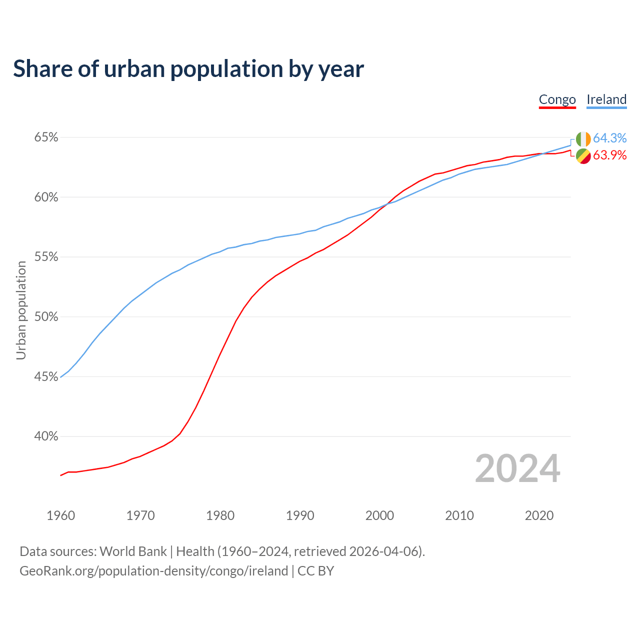 From 2004 to 2024, the share of urban population changed from 60.9% to 63.9% in the Congo and from 60.2% to 64.3% in Ireland.