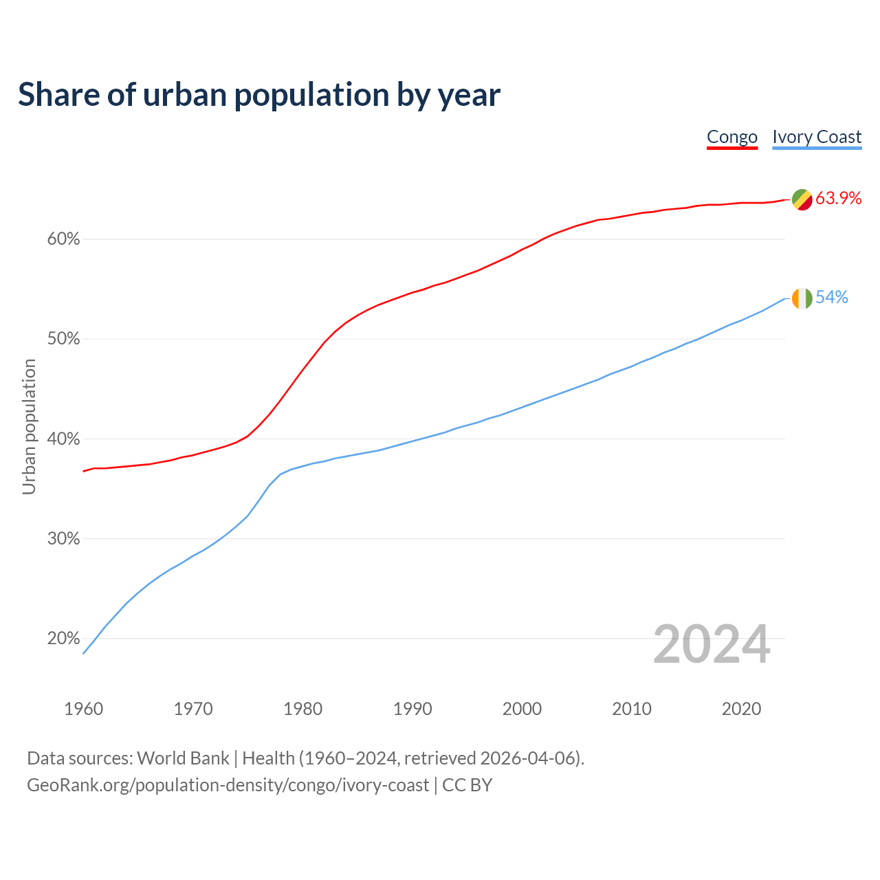 From 2004 to 2024, the share of urban population changed from 60.9% to 63.9% in the Congo and from 44.7% to 54% in Ivory Coast.