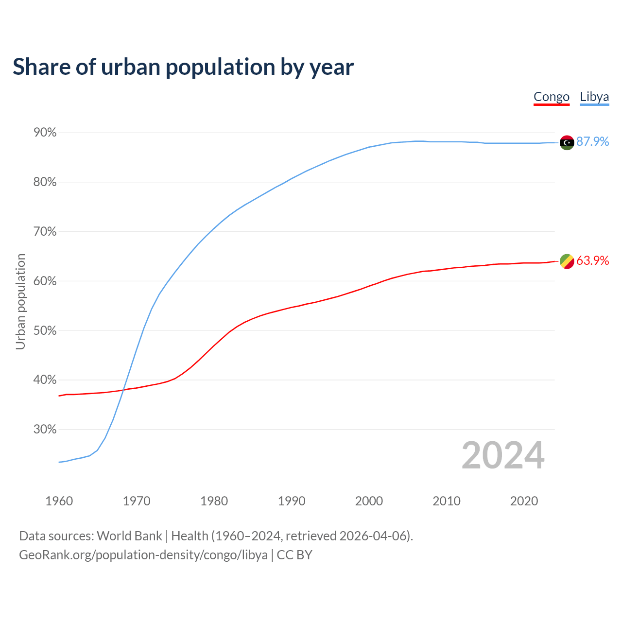 From 2004 to 2024, the share of urban population changed from 60.9% to 63.9% in the Congo and from 88% to 87.9% in Libya.
