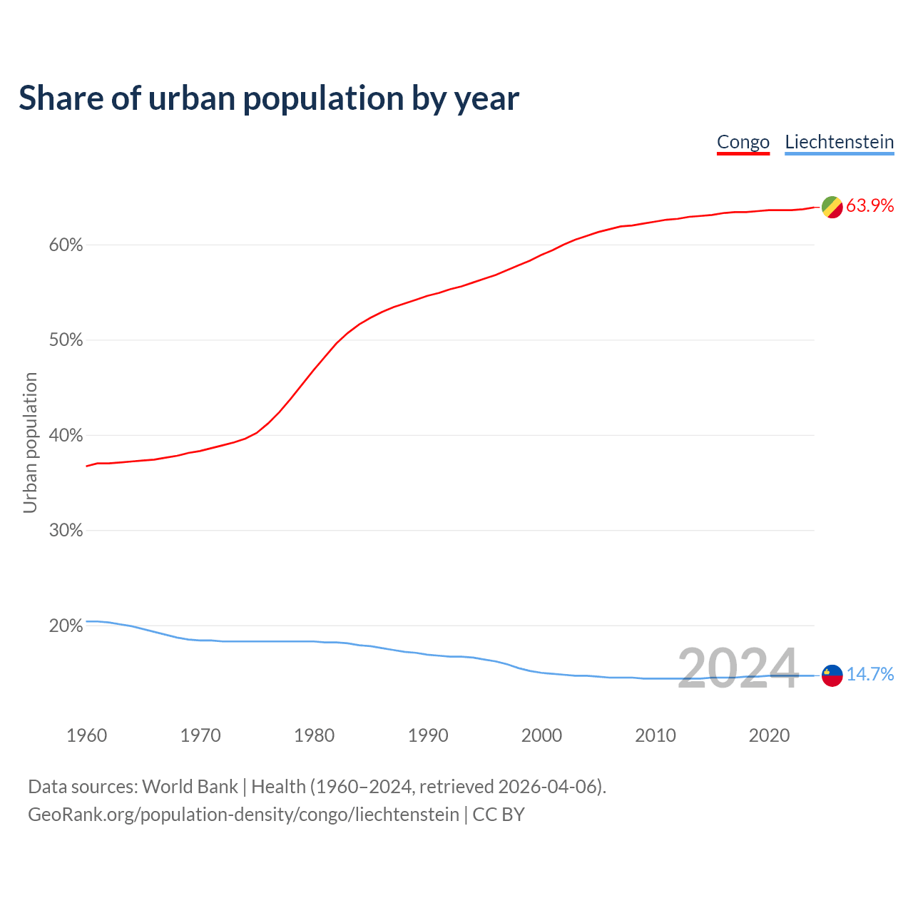 From 2004 to 2024, the share of urban population changed from 60.9% to 63.9% in the Congo and from 14.7% to 14.7% in Liechtenstein.