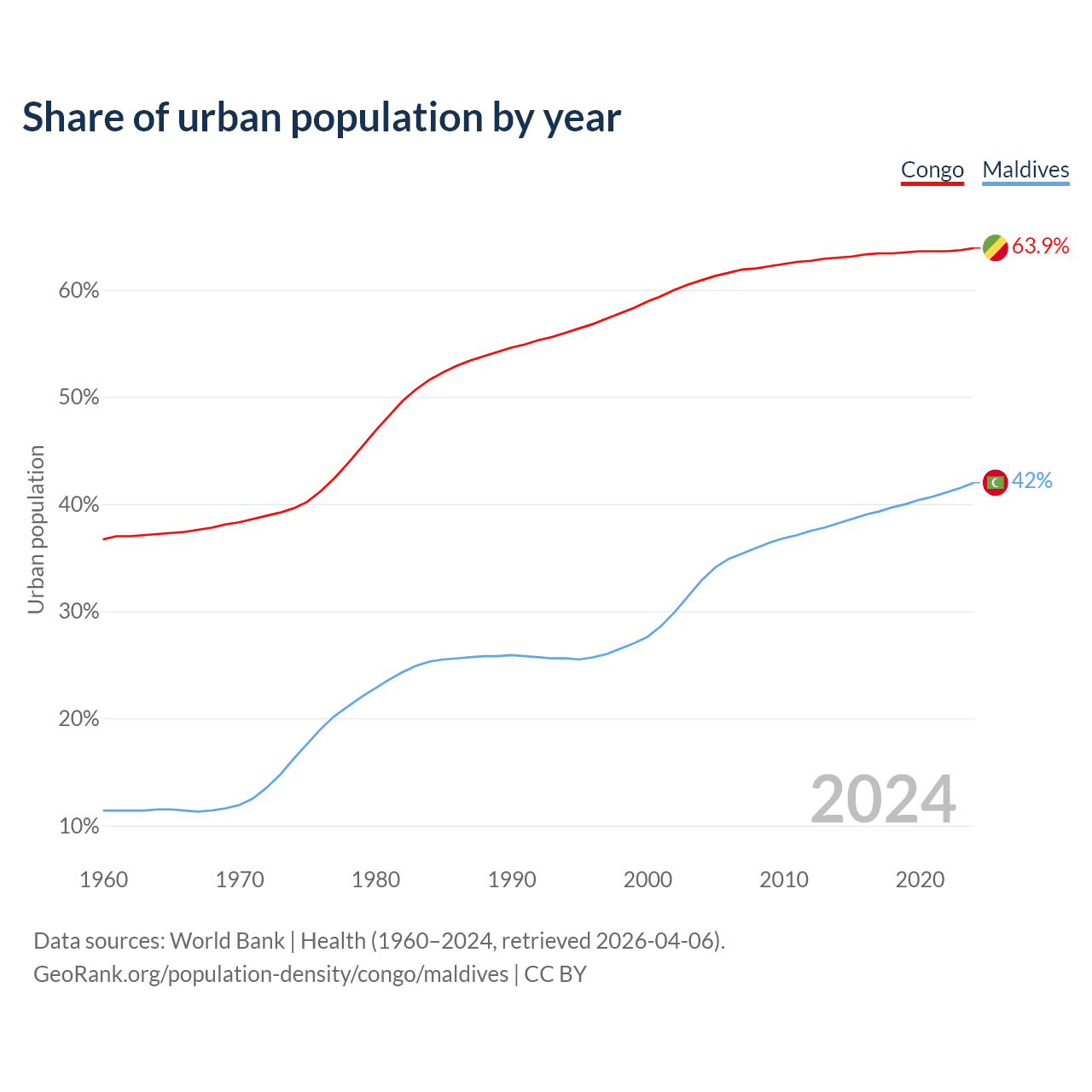 From 2004 to 2024, the share of urban population changed from 60.9% to 63.9% in the Congo and from 32.9% to 42% in Maldives.